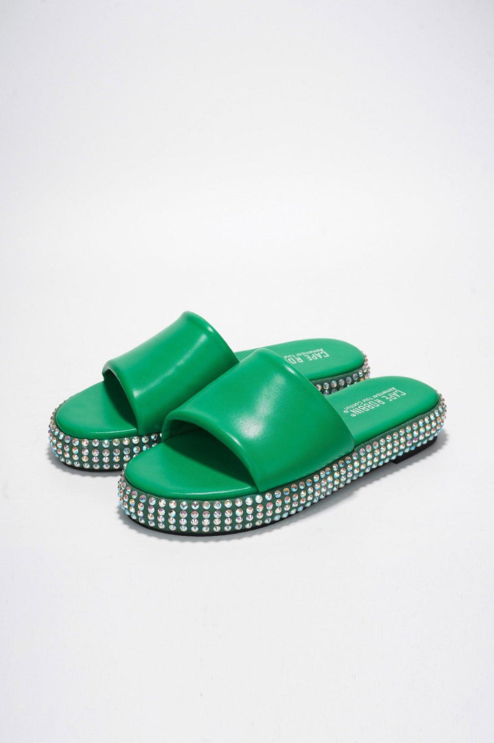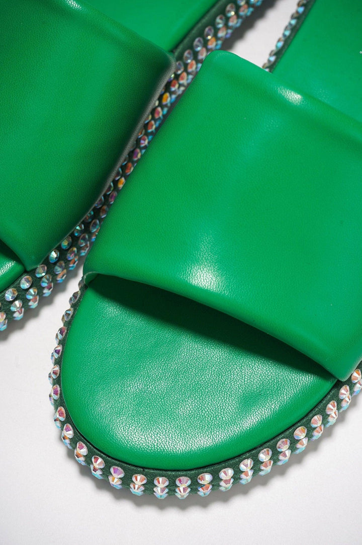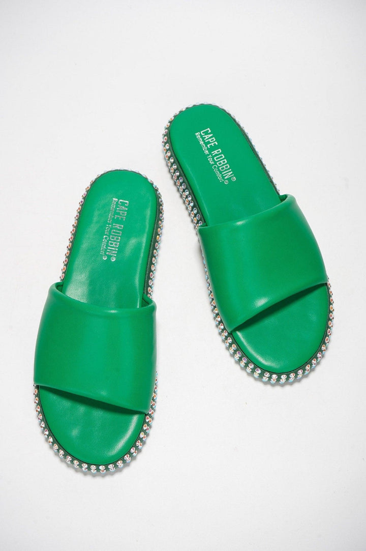 DAMDAM - GREEN - SANDALS by CAPE ROBBIN round toe flat slide sandals rhinestone coated PU flat footbed wide foot friendly Add a touch of glamour to your look with these dazzling Damdam sandals. Crafted with a sleek,minimalist silhouette,the midsole is adorned with a sparkling array of rhinestones that will catch the light with every step. Choose from black,orange,pink,or green to complete your ensemble.