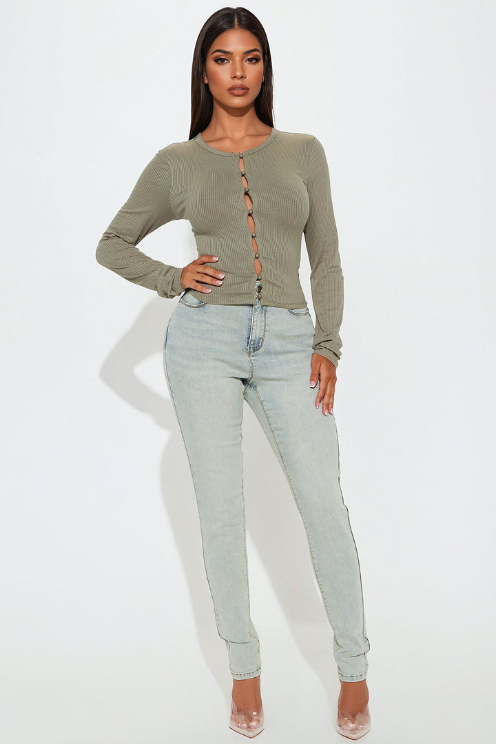 Available In Black, Burgundy, Lavender And Olive. | Button Front Top | Crew Neck | Long Sleeve | Cropped | Stretch | 97% Rayon, 3% Spandex | Imported