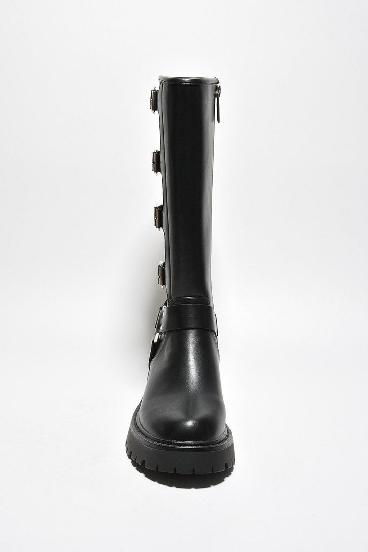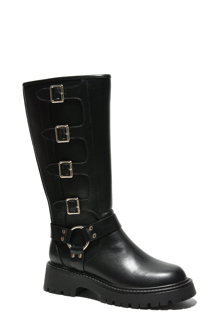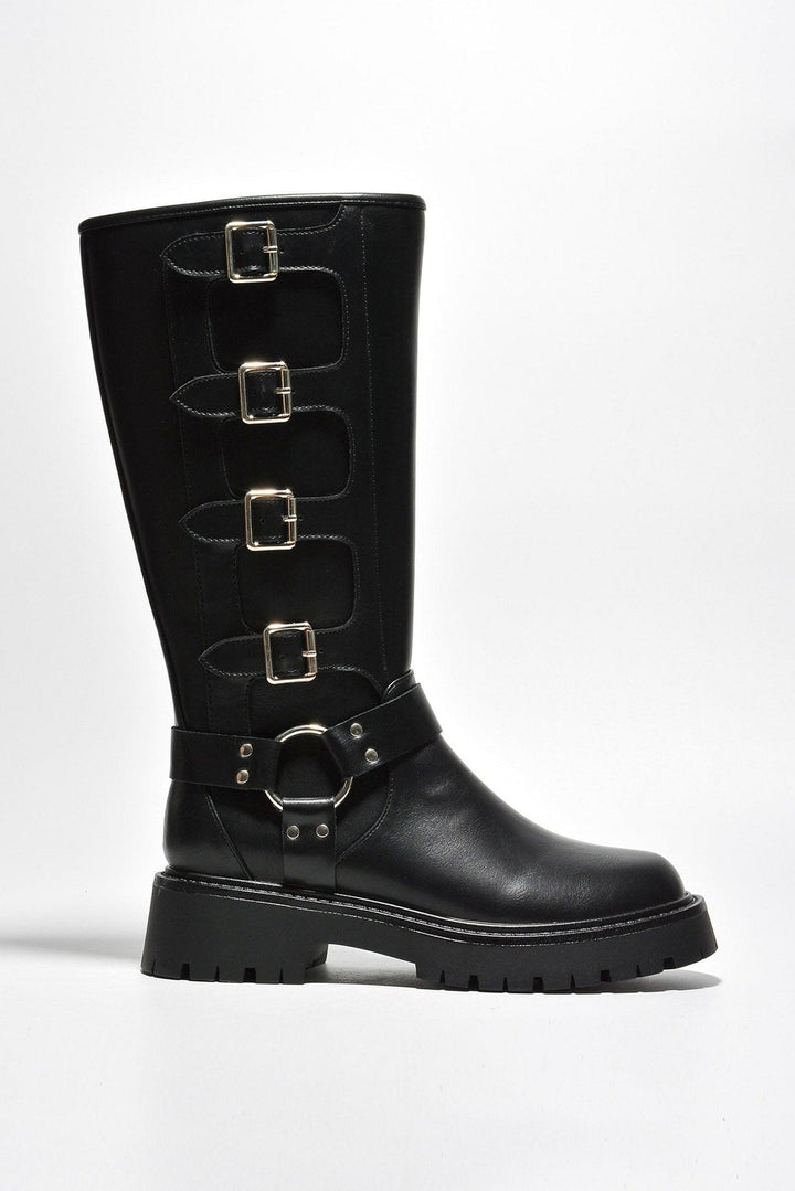 DAYTON - BLACK - BOOTS by CAPE ROBBIN closed square toe PU metallic denim lightly cushioned footbed block heel true to size rubber outsole zipper closure Dayton's calf-length biker-inspired boots bring all the style and attitude you need. Features strap accents and buckle hardware for a perfectly edgy vibe.