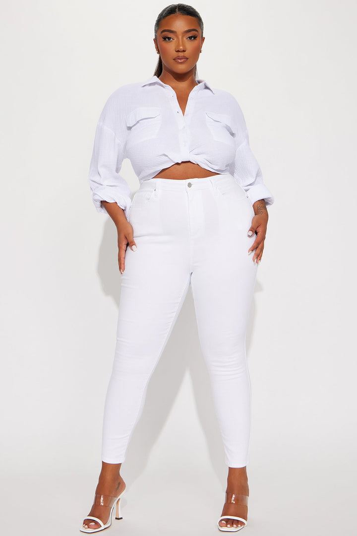 Available In Hot Pink And White. | Gauze Shirt | Long Sleeve | Collared | Button Down Front | Twist Front Detail | 2 Chest Pockets | Roll Up Sleeves | Cropped | 100% Cotton | Imported