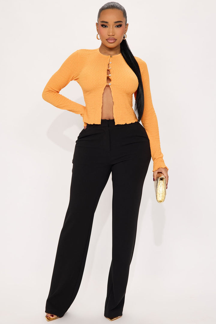 Available In Orange. | Long Sleeve Top | Stretch | Button Up | Lettuce Hem | 97% Polyester 3% Spandex | Imported