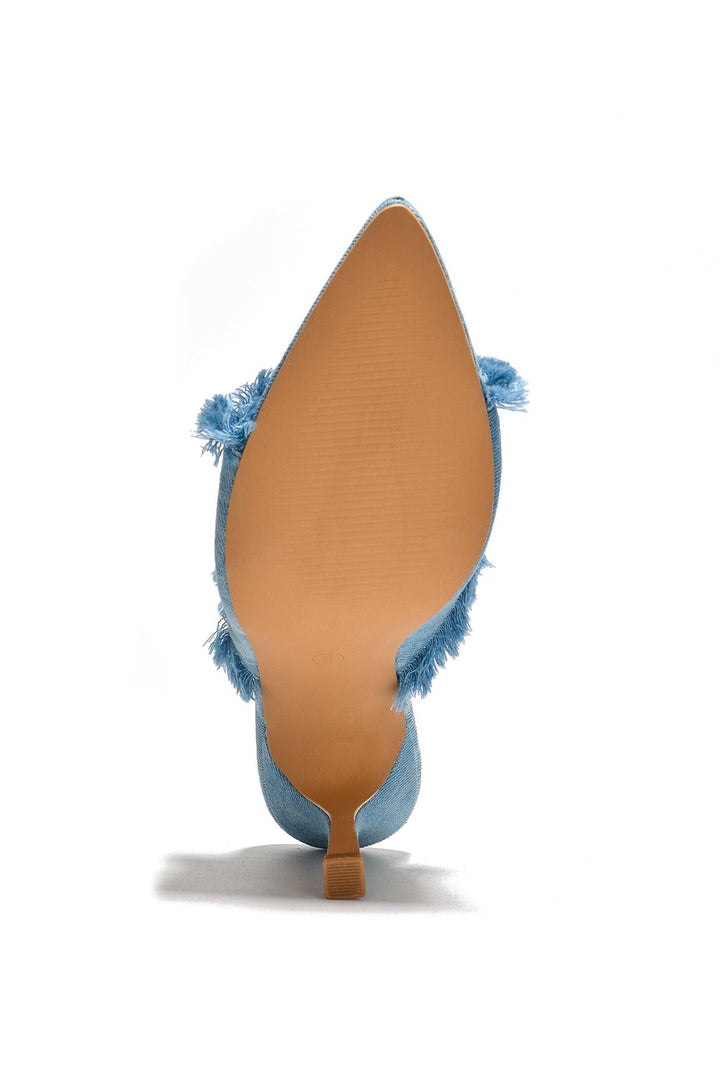 DENIA - DENIM - HEELS by CAPE ROBBIN open pointy toe denim PU lightly cushioned footbed rubber outsole Cape Robbin is spilling the jeans! Denia features a peep toe,washed denim,and fringe trim. These heels,crafted with choice materials,are sure to be a part of your collection for years.