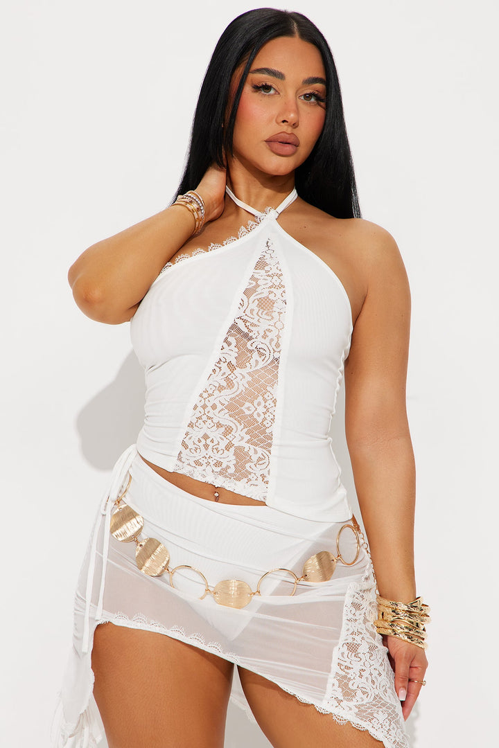 Available In White. | Mesh Top | Lace Trim | Halter | Cropped | Stretch | Self: 96% Nylon 4% Spandex | Contrast: 55% Cotton 45% Nylon | Lining: 92% Polyester 8% Spandex | Imported