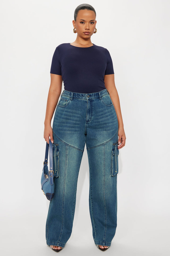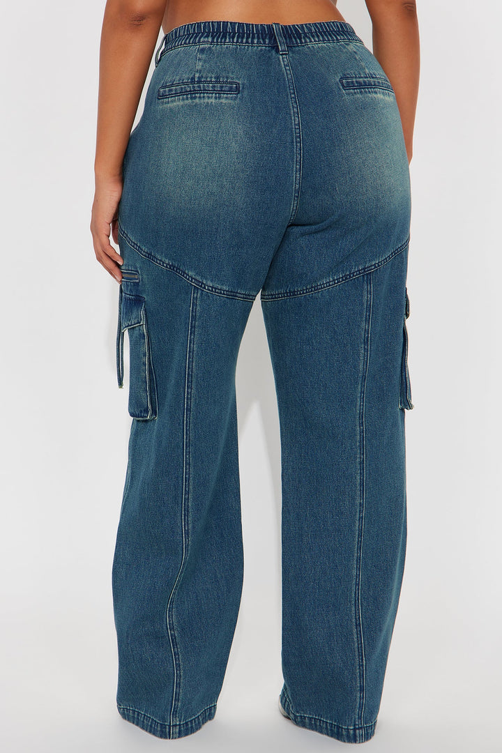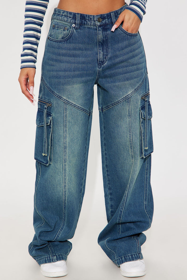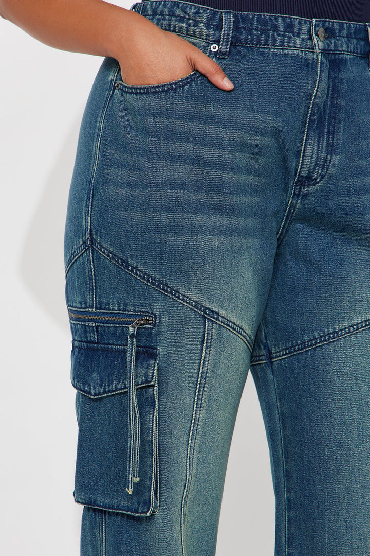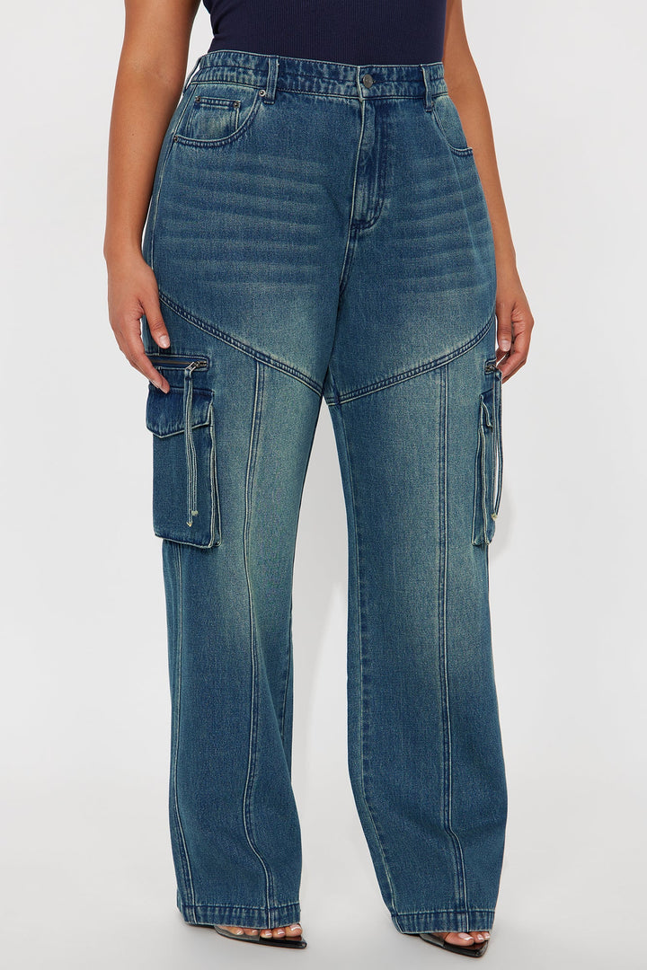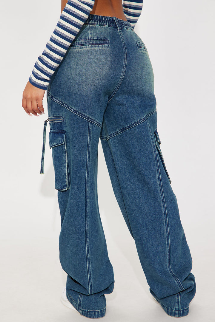 Available In Medium Wash And Vintage Wash. | Pair With Devil In Disguise Cargo Denim Jacket | Straight Leg Jean | Cargo Pockets | Elastic Back Waistband | Zip Detail | Non Stretch | 11.5" High Rise | 33" Inseam | Disclaimer Due To The Specialized Wash Process, Each Garment Is Unique. | 100% Cotton | Imported