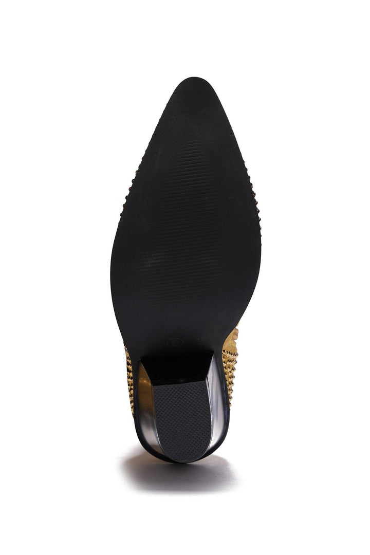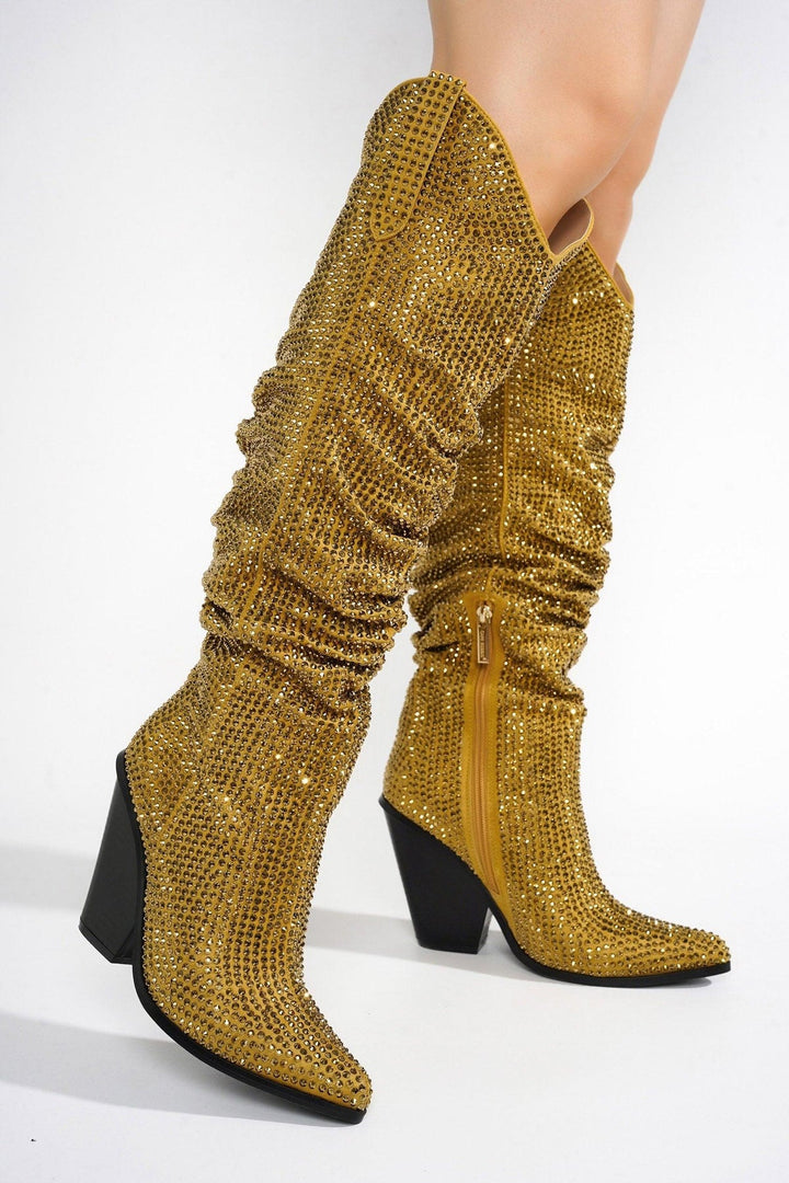 DIAMANTE - GOLD - BOOTS by CAPE ROBBIN black rhinestone boots block heels diamante detail ruffle detail padded insole pointed toe knee high boots These stunning Diamante rhinestone boots are the perfect combination of style and comfort. Featuring a block heel for a comfortable fit,these boots have a dazzling diamante detail and a delicate ruffle detail for a touch of femininity. The padded insole ensures your feet stay comfortable all day,while the pointed toe and knee high design make the boots a statement piece. Whether you’re heading to a special occasion or just out with friends,these boots will take your look to the next level.