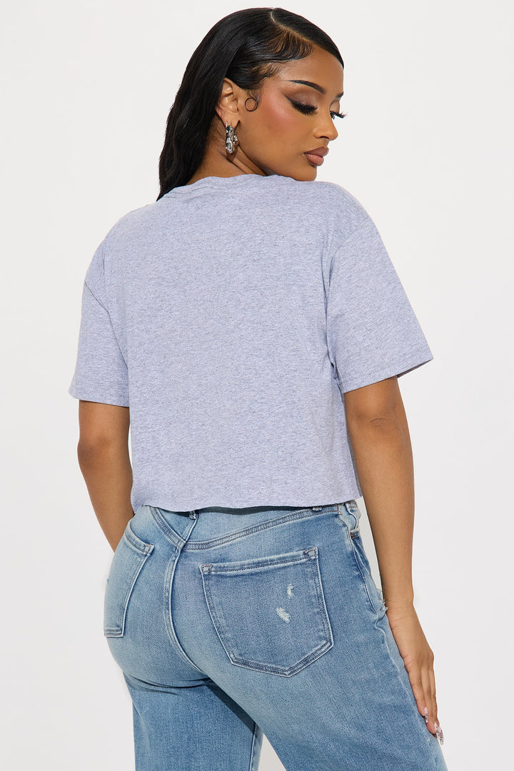 Available In Heather Grey. | TShirt | Crew Neck | Short Sleeve | Cropped | Raw Cut Hem | Disclaimer: Due To The Printing Process A Difference In Saturation May Occur. Each Garment Is Unique. | 100% Cotton | Imported