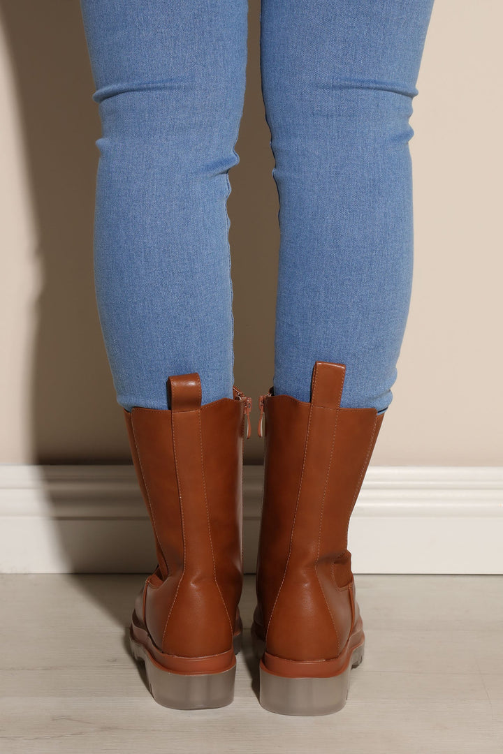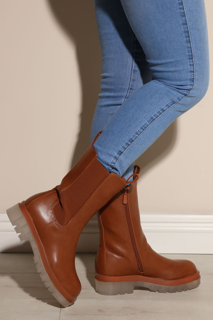 Available In Black, Nude And Tan. | Round Toe | Clear Lug Sole Bottom | Side Gore Detail | Side Zipper | 1" Low Heel | Imported