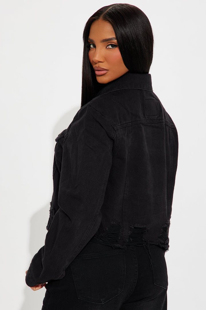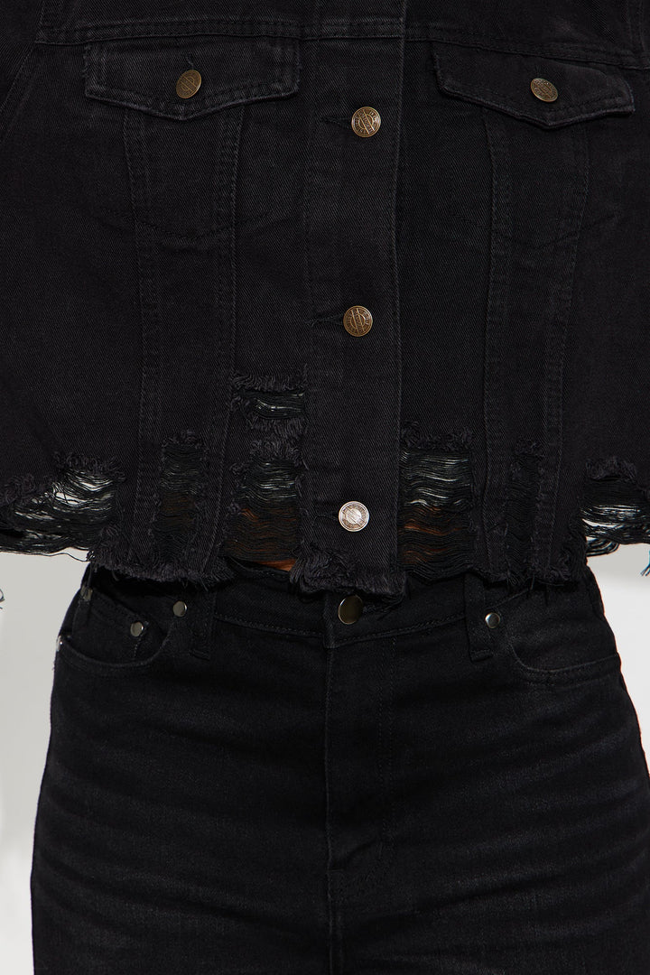 Available In Black And Dark Wash. | Denim Trucker Jacket | Collar | Long Sleeve | Button Closure | Distressed Hem | Disclaimer: Due To The Specialized Wash & Distressing Process, Each Garment Is Unique. | Non Stretch | 70% Cotton 20% Polyester 10% Rayon | Imported