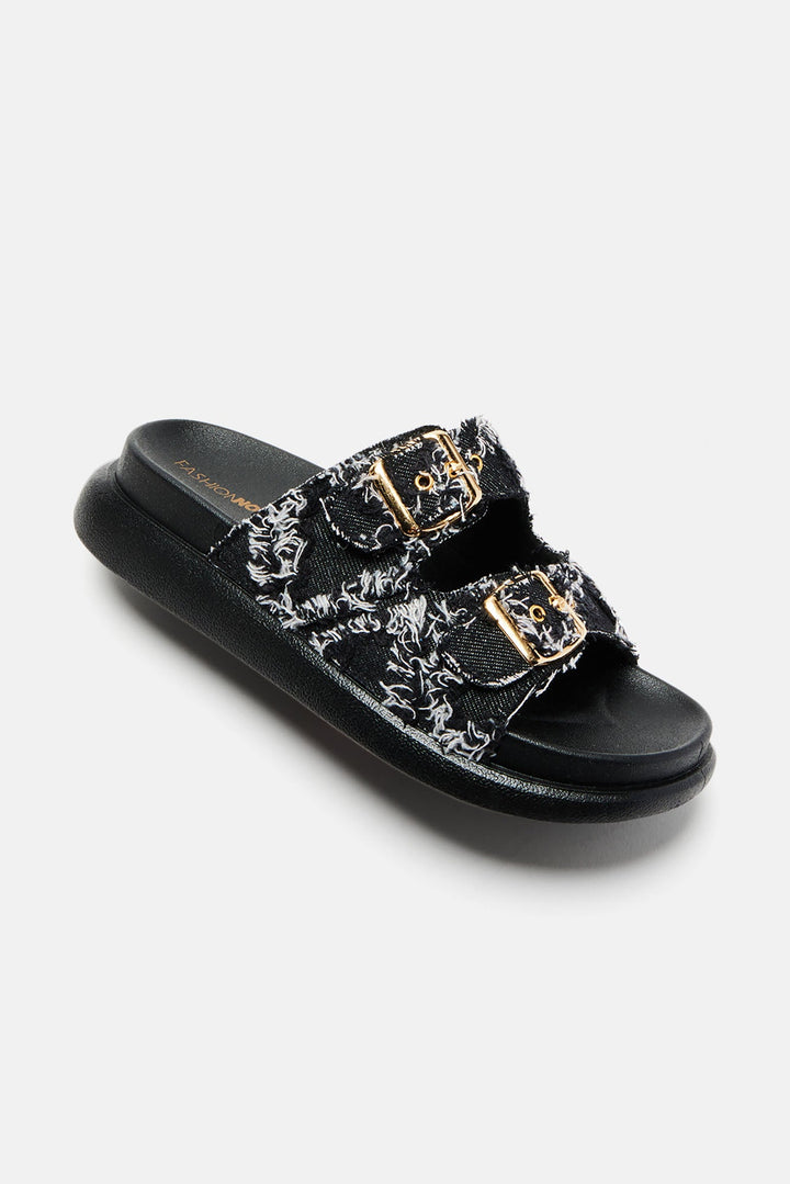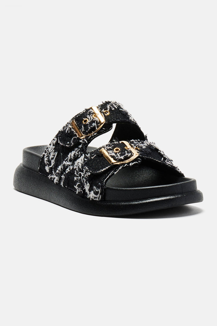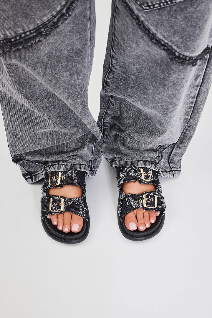 Available In Black. | Flat Sandals | Distressed Detail | Buckle Detail | Round Toe | Flat Heel | Disclaimer: Due To The Specialized Wash & Distressing Process, Each Garment Is Unique. | Imported