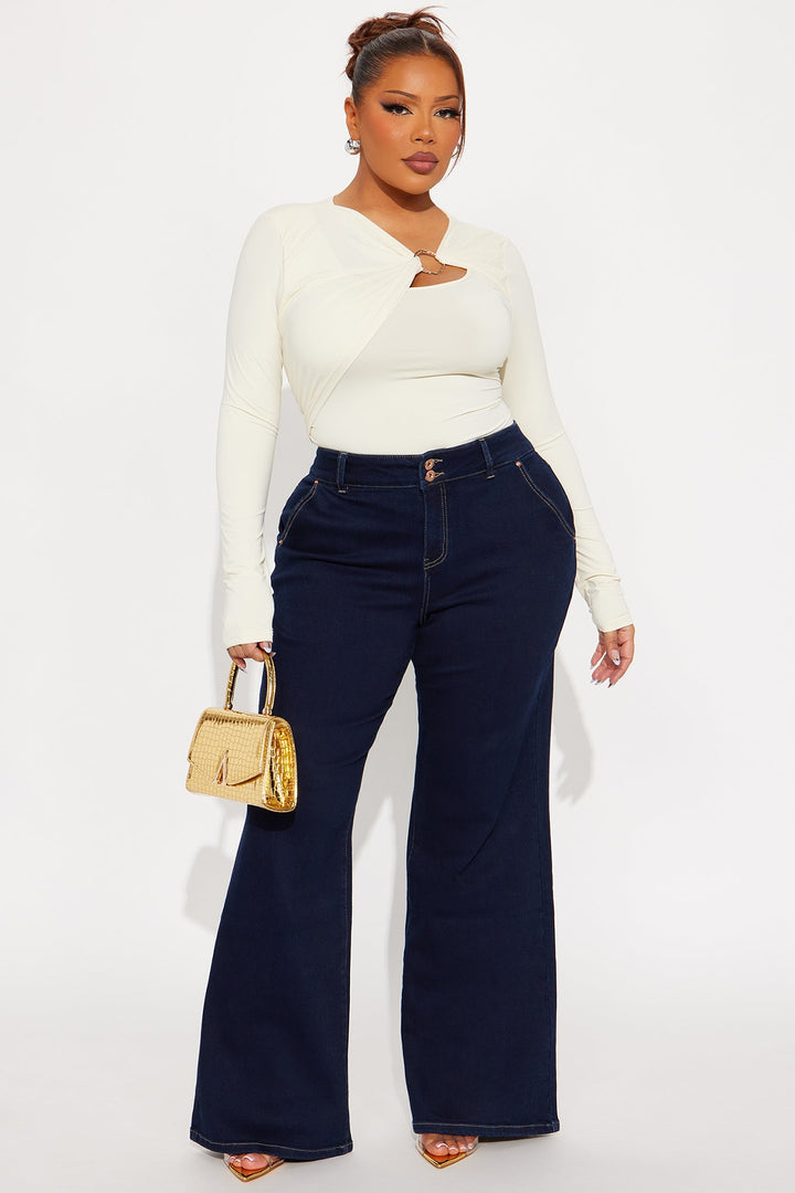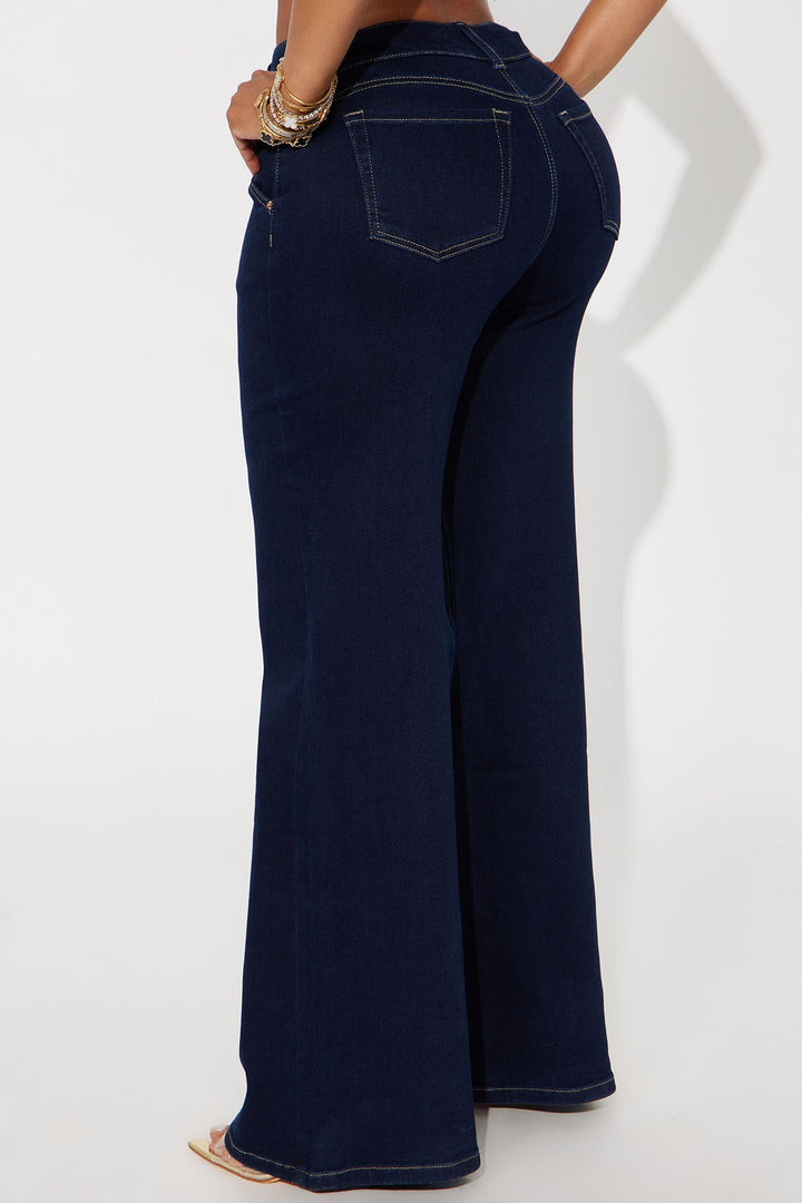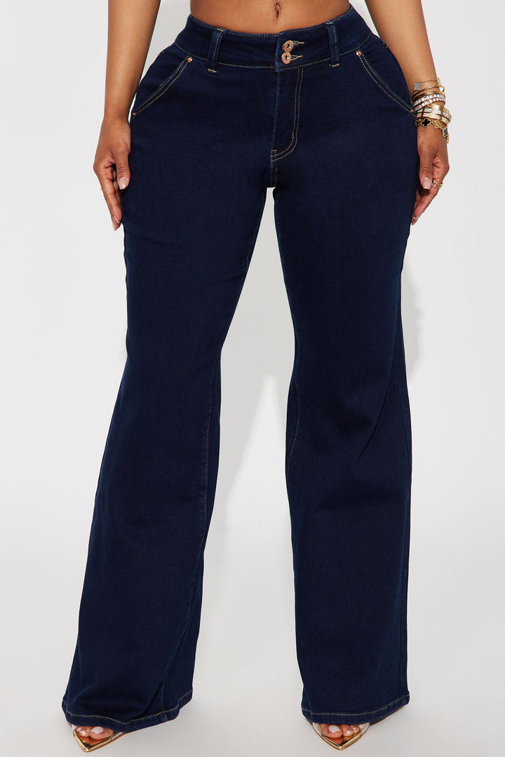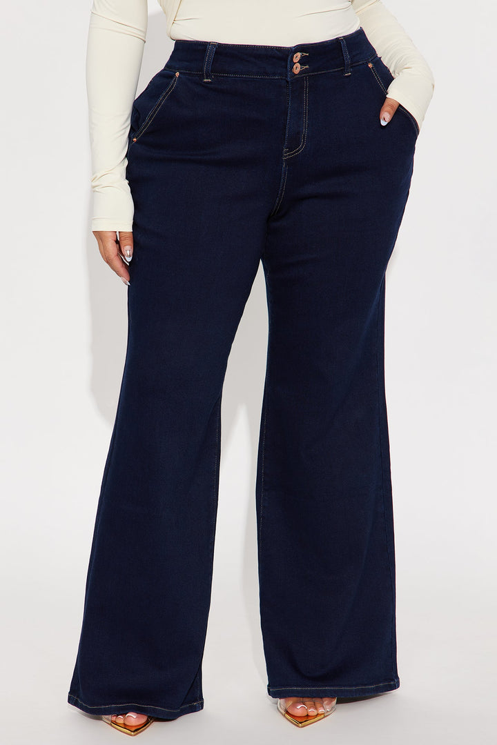 Available In Dark Denim. | Wide Leg Jean | Medium Stretch | Double Button | Trouser Pockets | 34" Inseam | 11" Rise | Disclaimer: Due the To The Specialized Dye Process, Loose Dye Can Stain On Contact. Do Not Wash with Other Garments | Self: 93% Cotton 5% Polyester 2% Spandex | Imported