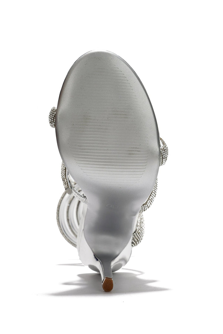 DYANA - SILVER - HEELS by CAPE ROBBIN Stiletto Heel: 4 inch Wraparound strappy heel PU leather insole with memory foam cushioning for added comfort Sparkling rhinestone-encrusted straps Round toe \