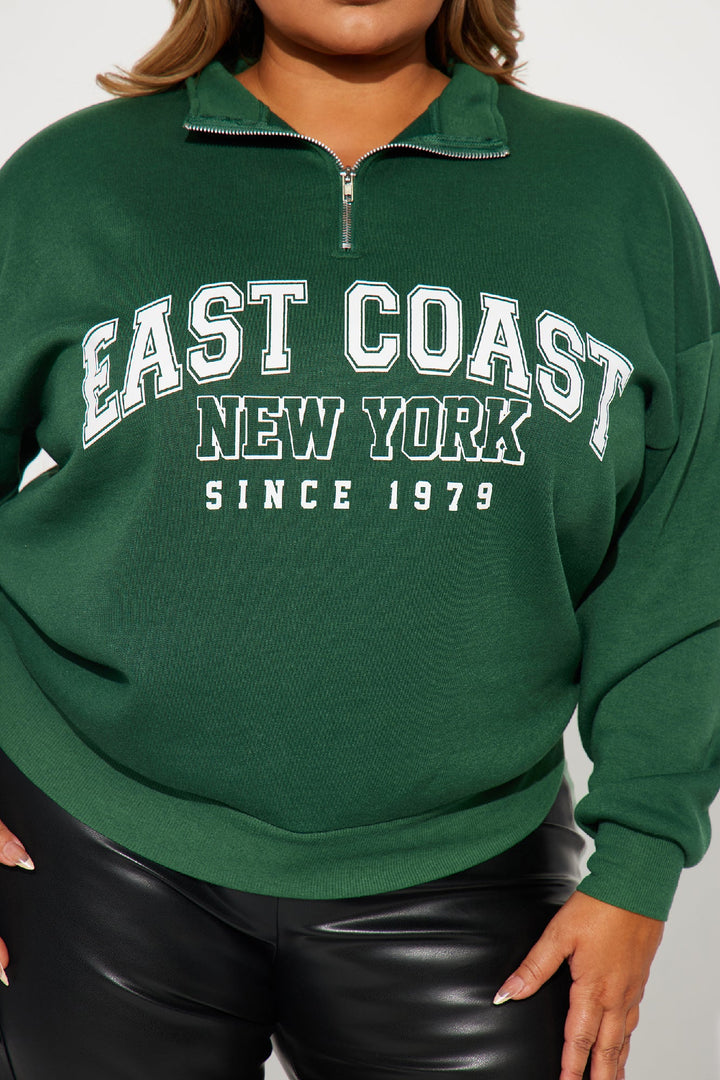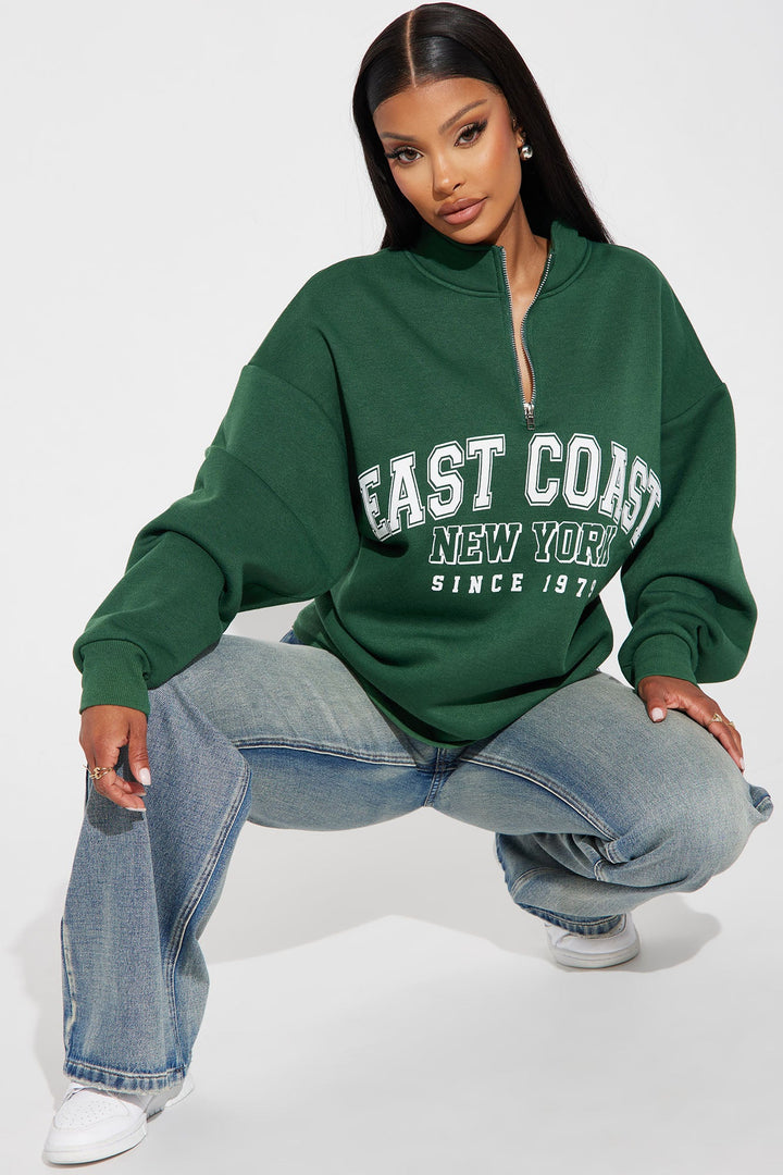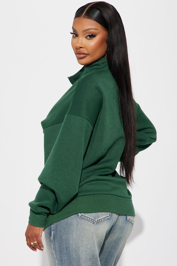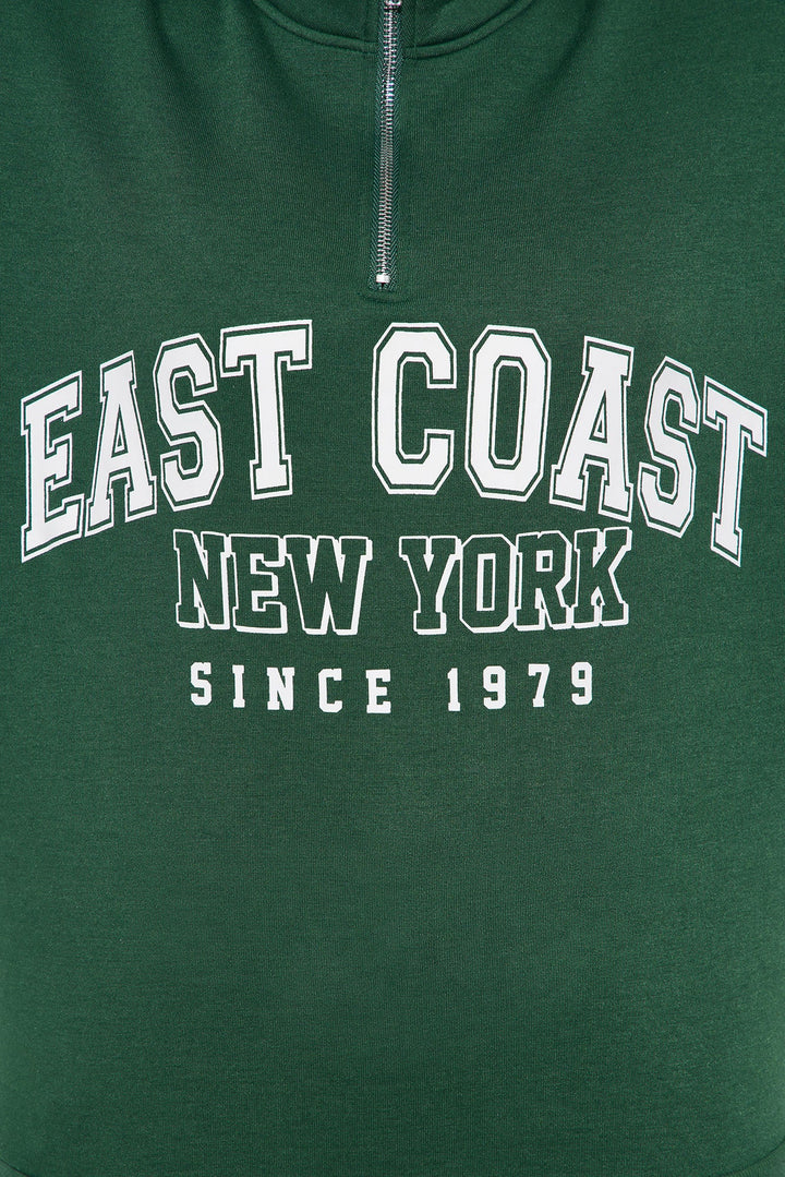 Available In Green. | Sweatshirt | Mock Neck | Long Sleeve | Front Screen Print | Half Zip Front Detail | Stretch | Disclaimer: Due To The Specialized Dye And Printing Process A Difference In Saturation May Occur. Each Garment Is Unique. | 100% Polyester | Imported