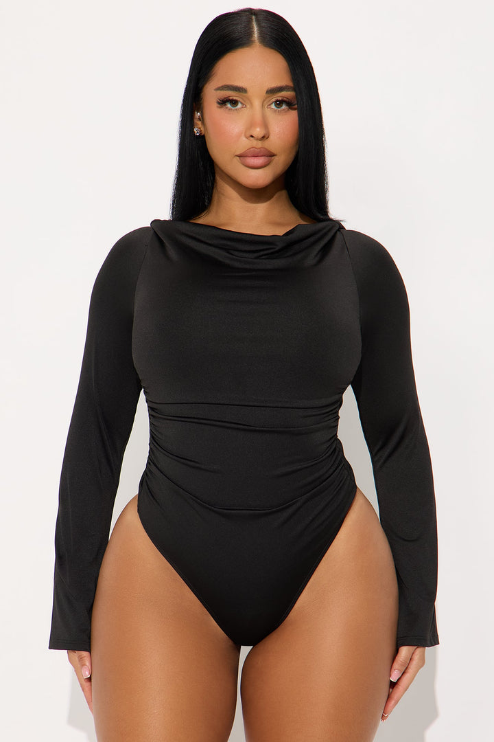 Available In Black And Stone. | Bodysuit | Boat Neck | Long Sleeve | Ruched | Tie Back | Cowled Back | Cheeky Bottom | Snap Closure | Stretch | Final Sale | 95% Polyester 5% Spandex | Imported