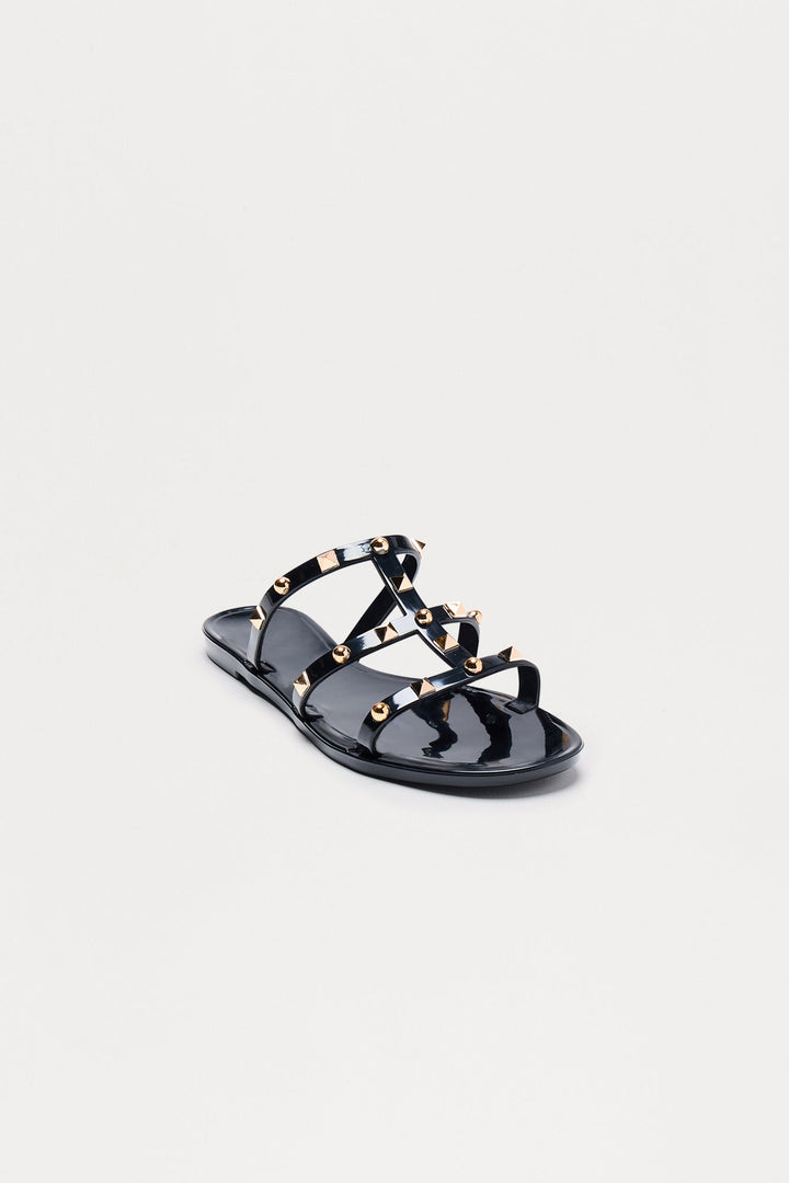 Available In Beige, Black, Lavender And Red. | Flat Sandals | Studded Detail | Round Toe | Flat Heel | Imported