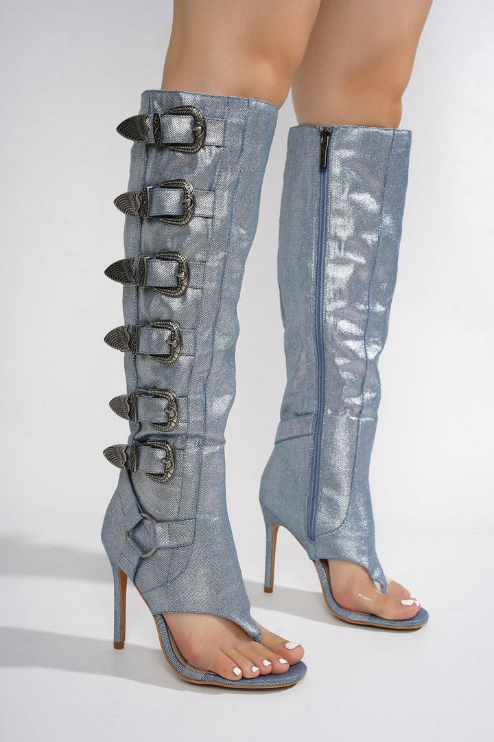 ELARAHH - DENIM - BOOTS by CAPE ROBBIN Open Round Toe 4 inch Skinny Heel Belt Buckle Design Memory Foam Insole The Elarahh Belt Buckle Open Round Toe Heel Boots are the embodiment of modern fashion. Experience the perfect fusion of fashion and comfort with Elarahh Boots – where sophistication meets practicality.