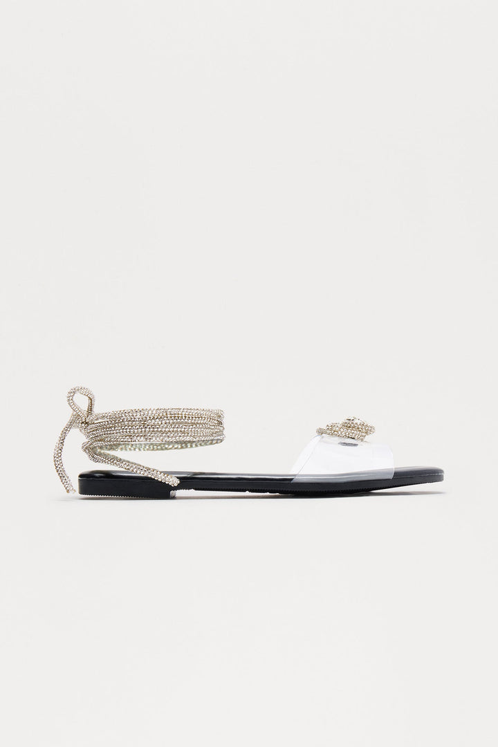 Available In Black, Pink And Silver. | Wrap Up Flat Sandals | Rhinestone Trim | Bow Detail | Clear Strap | Square Toe | Flat Heel | Imported