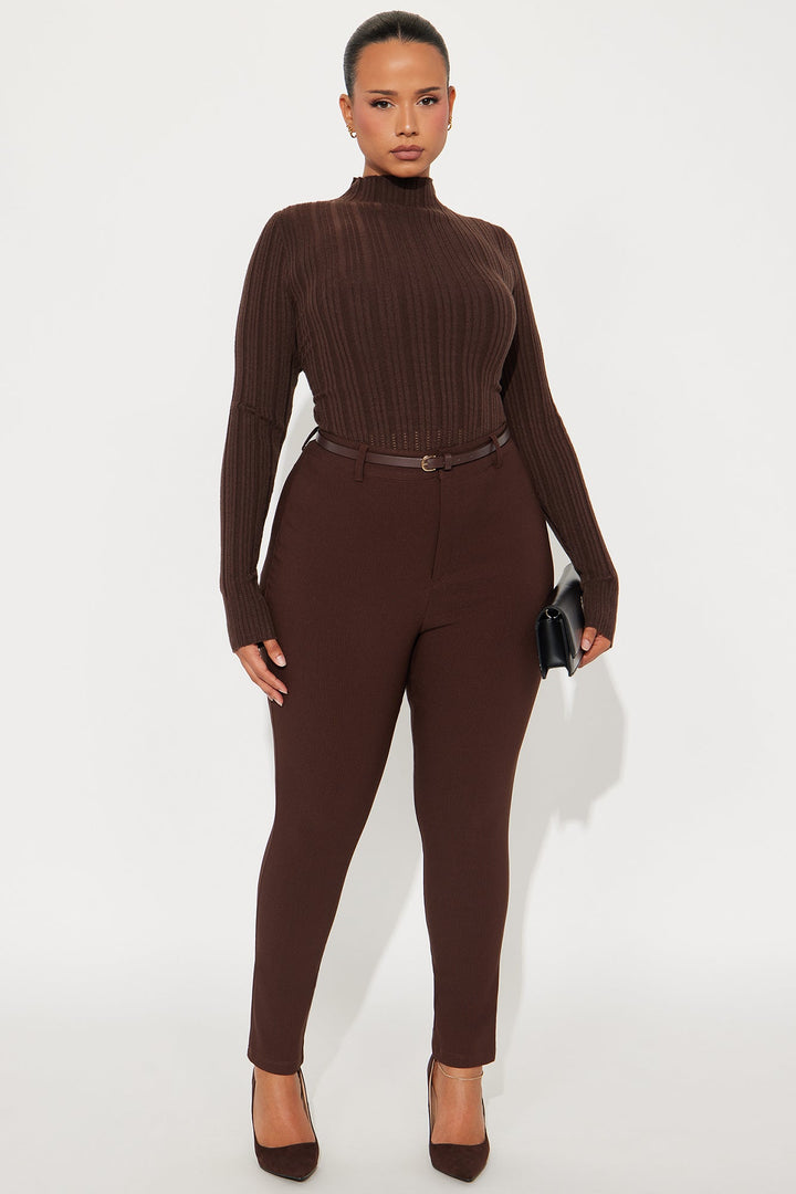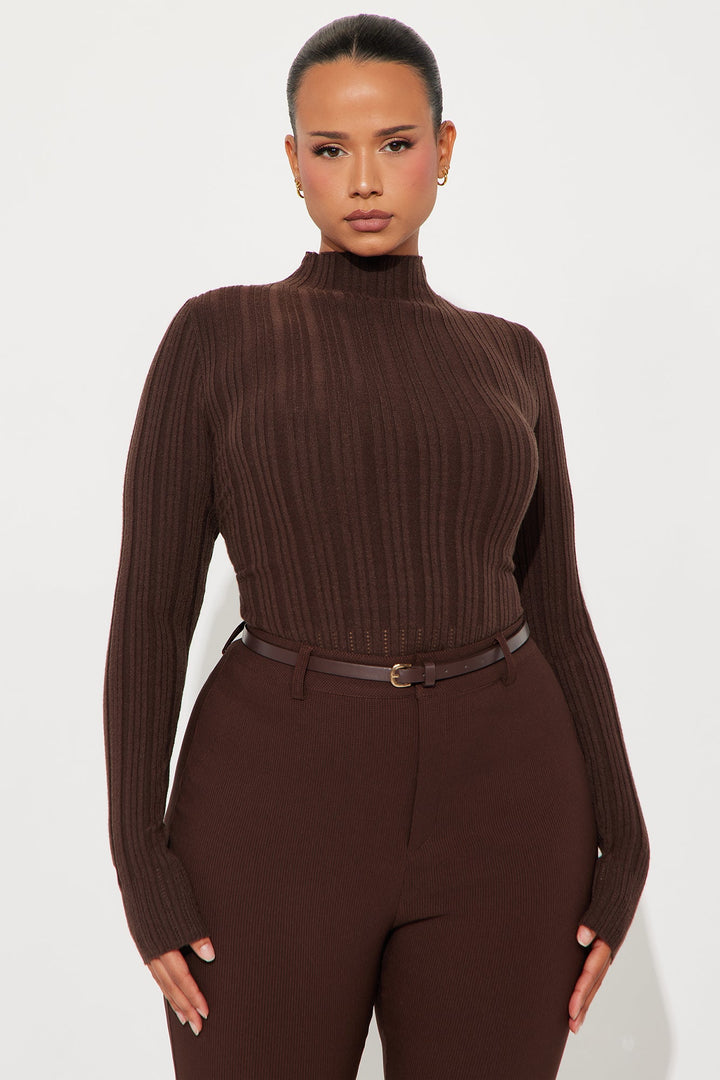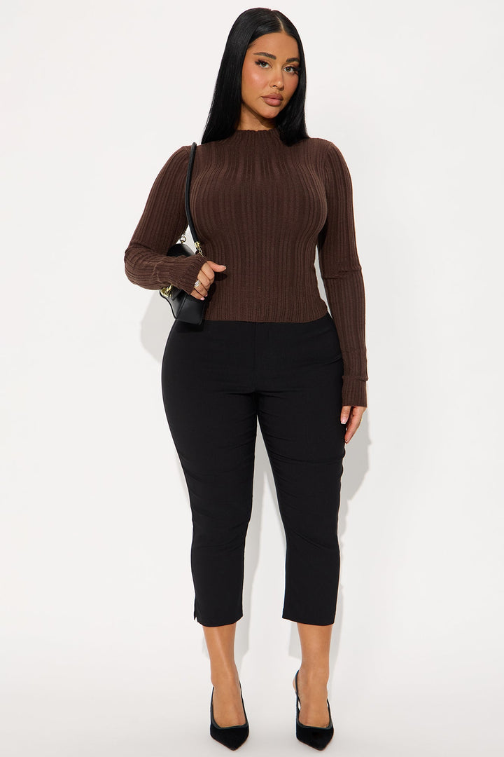Available In Butter Yellow, Chocolate And Cream. | Pullover Sweater | Mock Neck | Pointelle Detail | 50% Rayon 30% Polyester 20% Nylon | Imported
