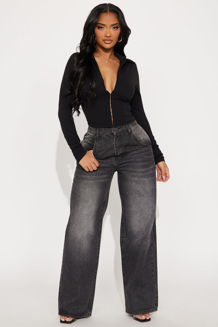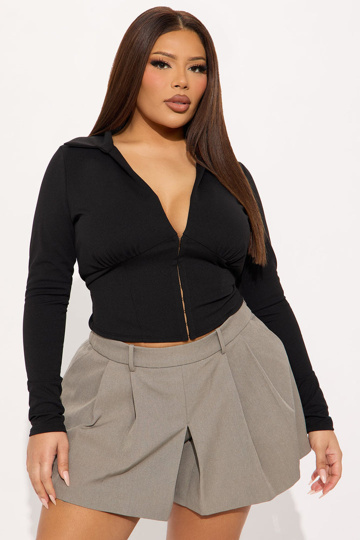 Available In Black. | Long Sleeve Top | Stretch | Collar | Seaming | Hook And Eye Closure | Cropped | 95% Polyester 5% Spandex | Imported