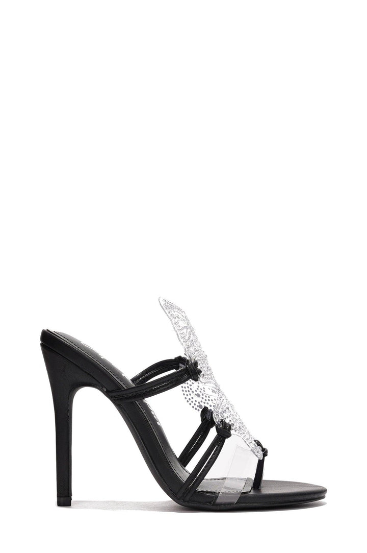 ELYSSA - BLACK - HEELS by CAPE ROBBIN Round Toe 4 Inch Heel Butterfly Deco With Rhinestone Slip On Memory Foam Footbed PU Leather Insole Crafted with meticulous attention to detail,these exquisite heels feature a delicate butterfly motif adorned with sparkling rhinestones,adding a touch of glamour to any ensemble.