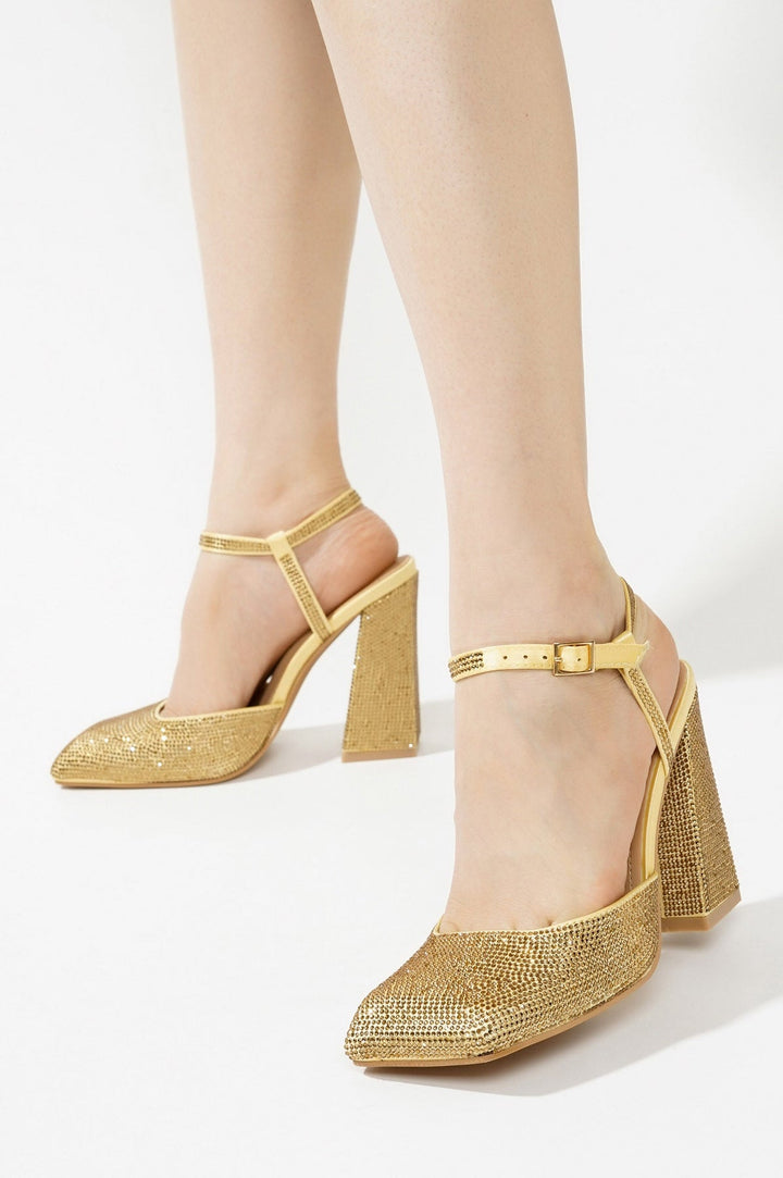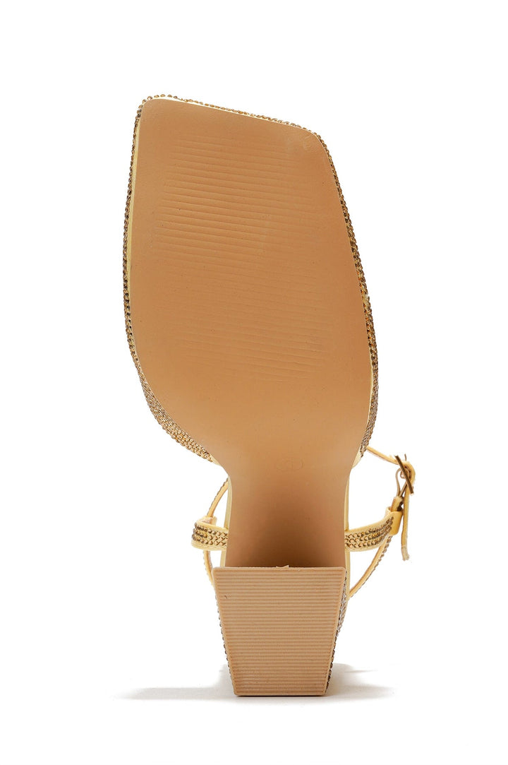 EMELIA - GOLD - HEELS by CAPE ROBBIN Block heel: 4-inch Ankel strap PU leather insole with memory foam cushioning Rhinestone embellished Square toe Step into sparkle with the Emelia heels. These heels offer all-day comfort and effortlessly pair with a variety of outfits, from evening gowns to cocktail dresses. The Emelia Rhinestone Embellished Block Heels are a versatile and glamorous addition to any wardrobe, perfect for weddings, galas, or stylish nights out.