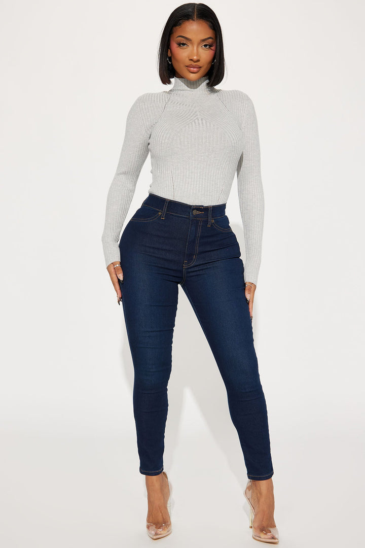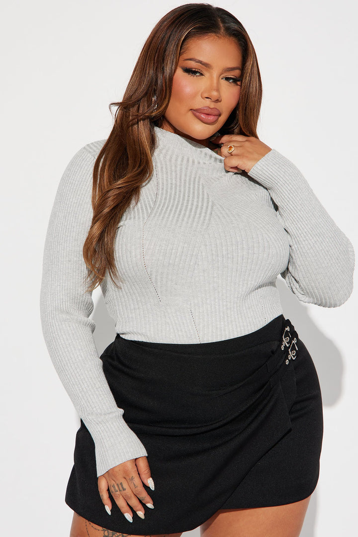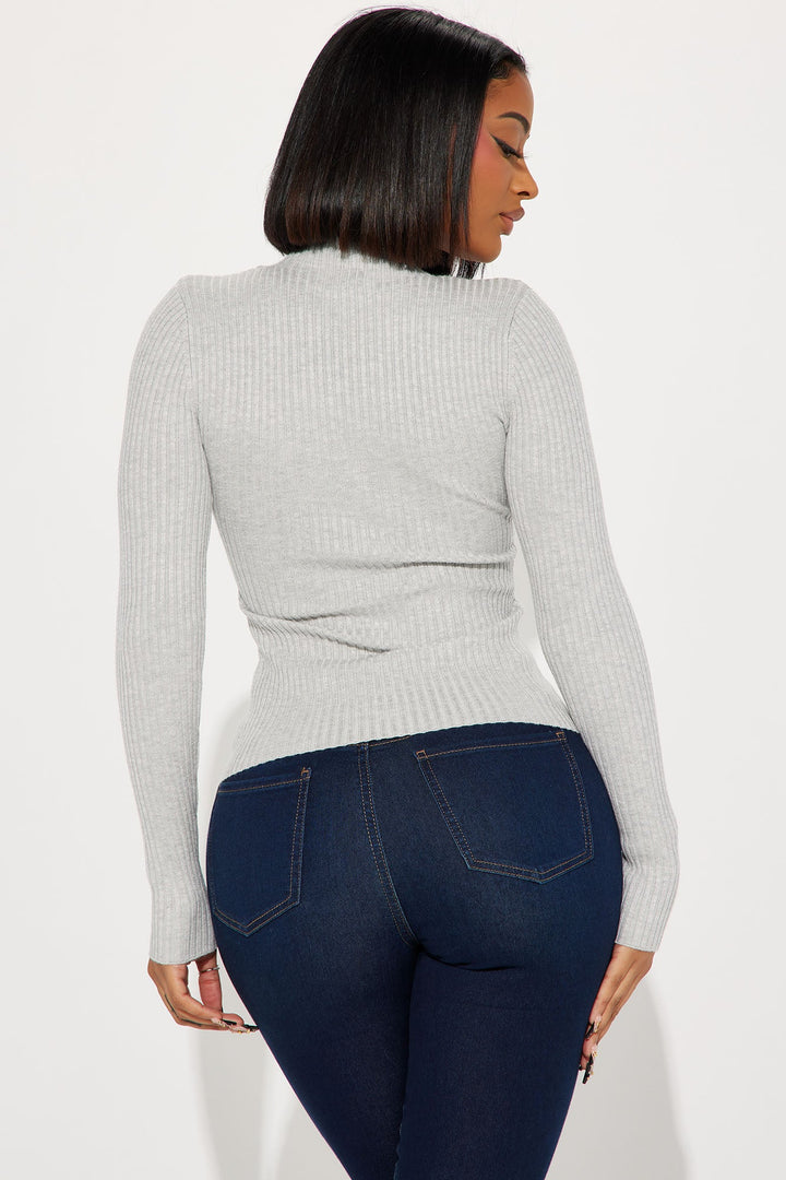 Available In Heather Grey. | Ribbed Mock Neck Sweater | Long Sleeve | 80% Viscose 20% Nylon | Imported