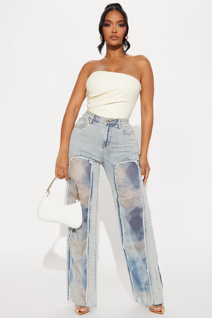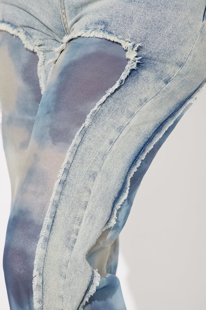 Available In Light Wash. | Wide Leg Jean | 5 Pocket | Mesh Insert | Fray Detail | 11" High Rise | 33" Inseam | High Stretch | Disclaimer: Due To The Specialized Wash And Print Placement Process, Each Garment Is Unique. | Self: 65% Cotton 31% Polyester 2.5% Viscose 1.5% Spandex | Contrast: 100% Polyester | Imported