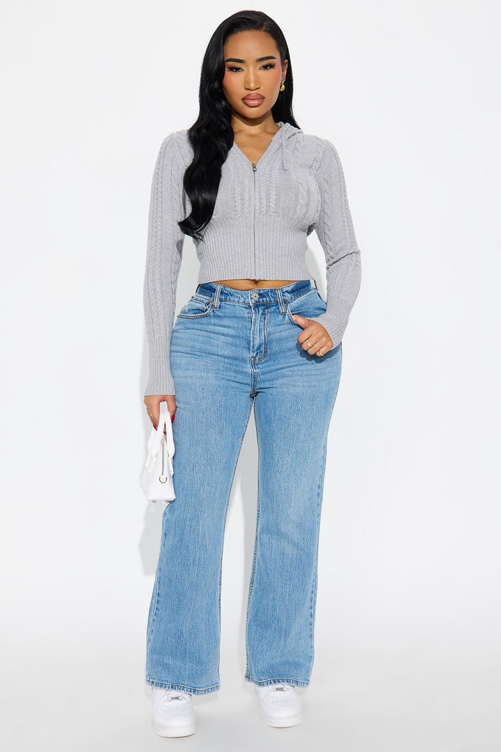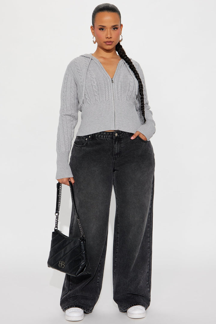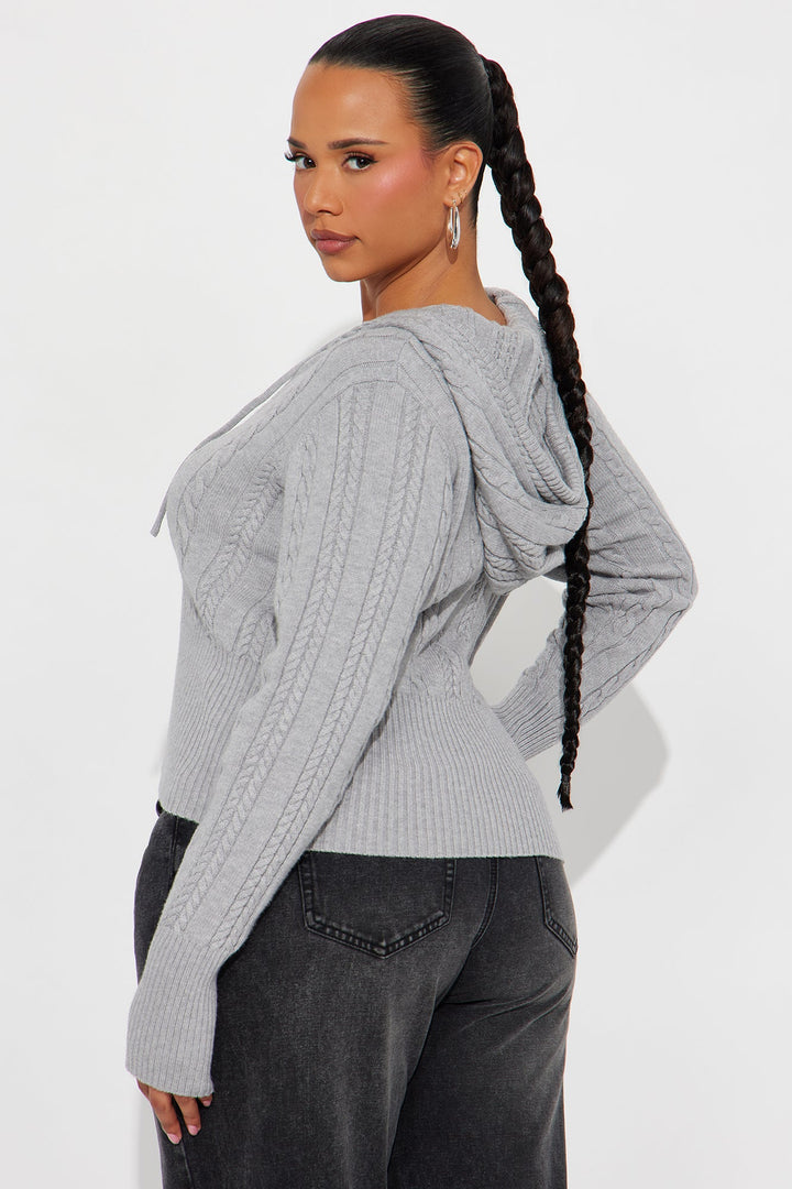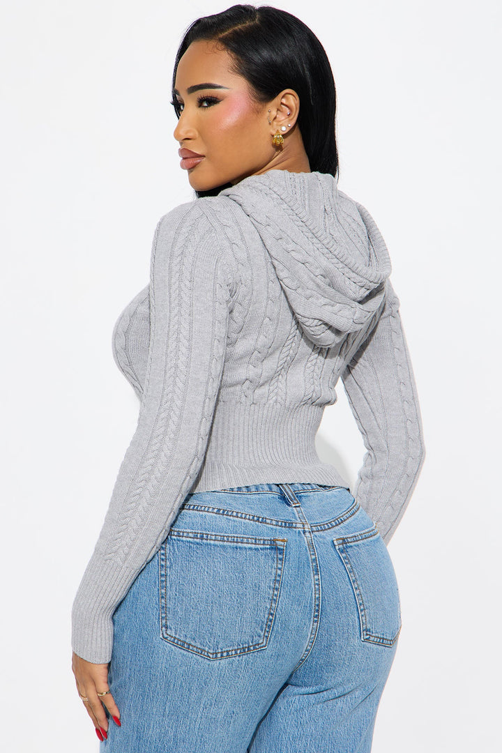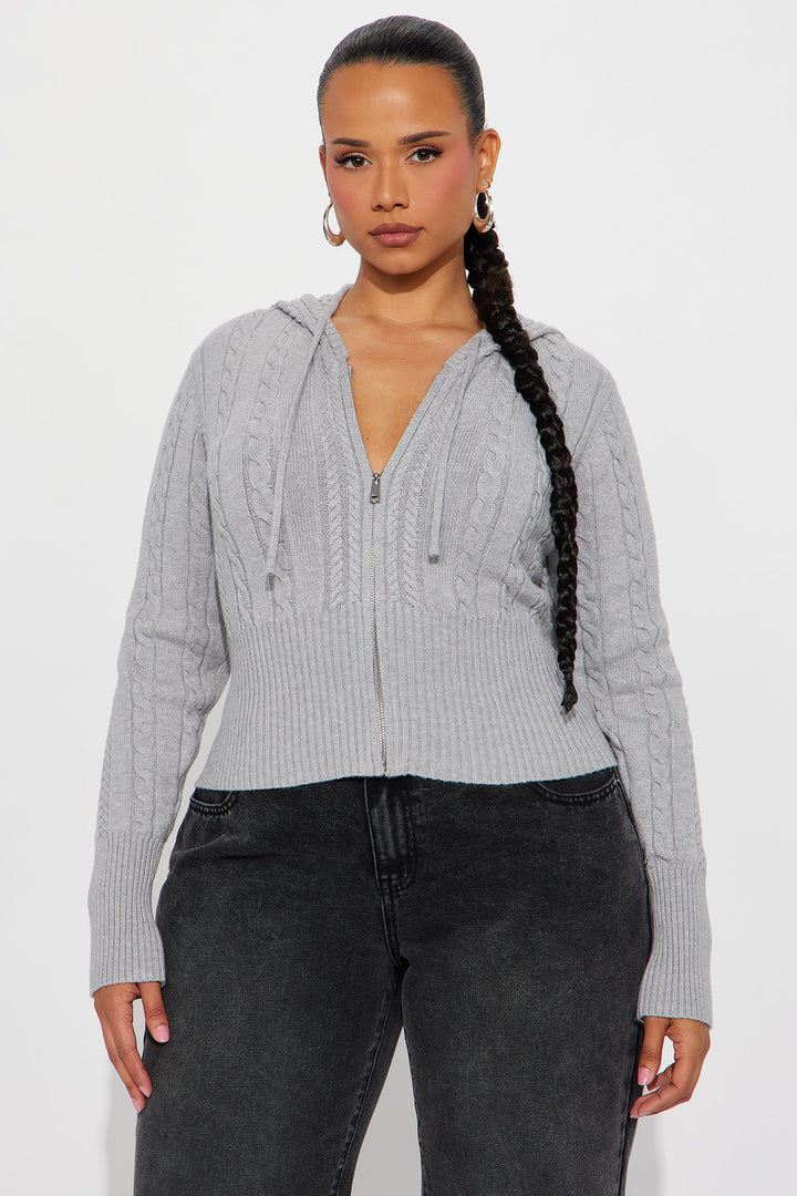 Available In Chocolate, Grey And Yellow. | Zip Front Sweater | Cable Knit Detail | Front Zip Closure | Hooded | Self: 50% Rayon 30% Polyester 20% Nylon | Imported