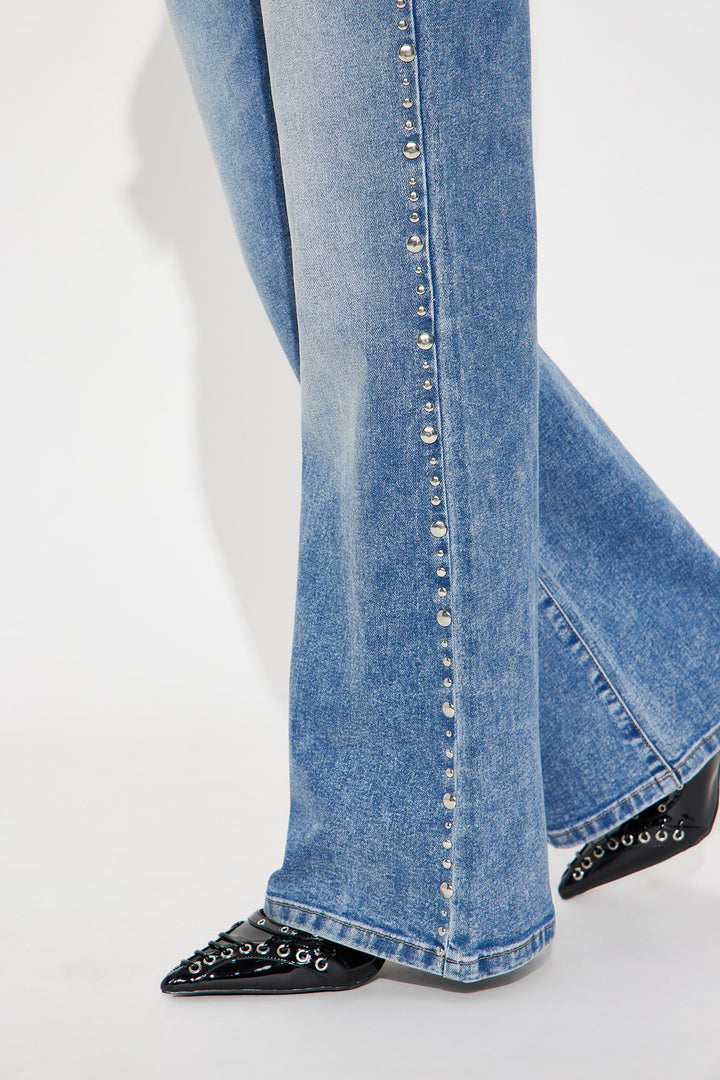 Available In Medium Wash. | Wide Leg Jean | 5 Pocket | Embellished | 10.5" High Rise | 33" Inseam | Medium Stretch | Disclaimer Due to the Wash Process, Each Garment Is Unique. | 89.5% Cotton 9% Polyester 1.5% Spandex | Imported