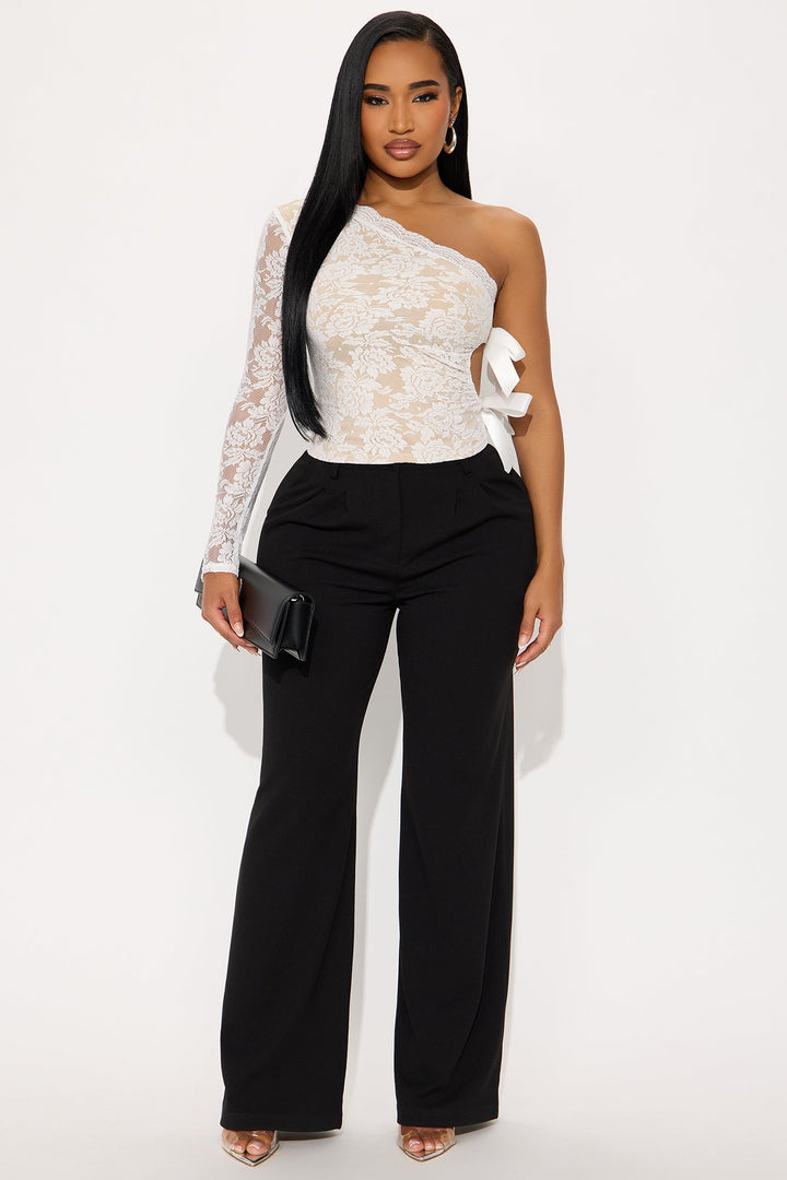 Available In Black, Eggplant And White. | Lace Top | One Shoulder | Cut Out | Bow Detail | Ruched | Stretch | Self : 100% Nylon | Contrast : 100% Polyester | Lining : 100% Polyester | Imported