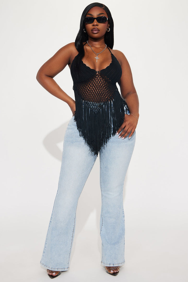 Available In Black And Cream. | Crochet Halter Top | Tie Neck | V Neck | Backless | Tie Back | Fringe Detail | 100% Acrylic | Imported