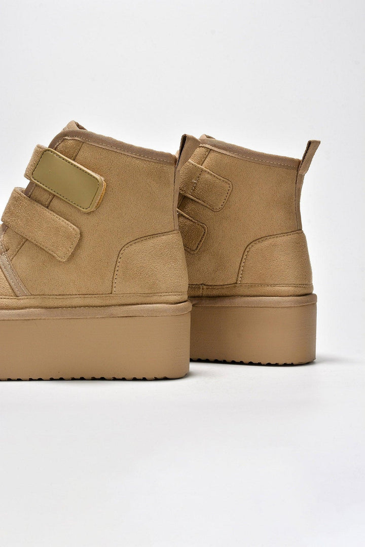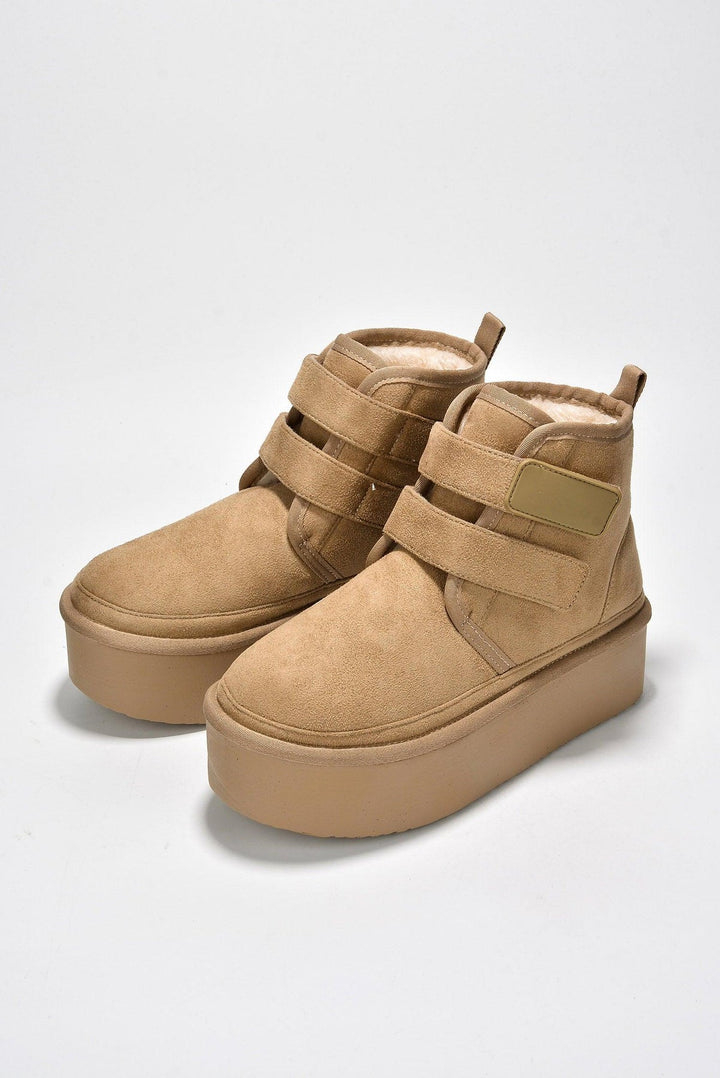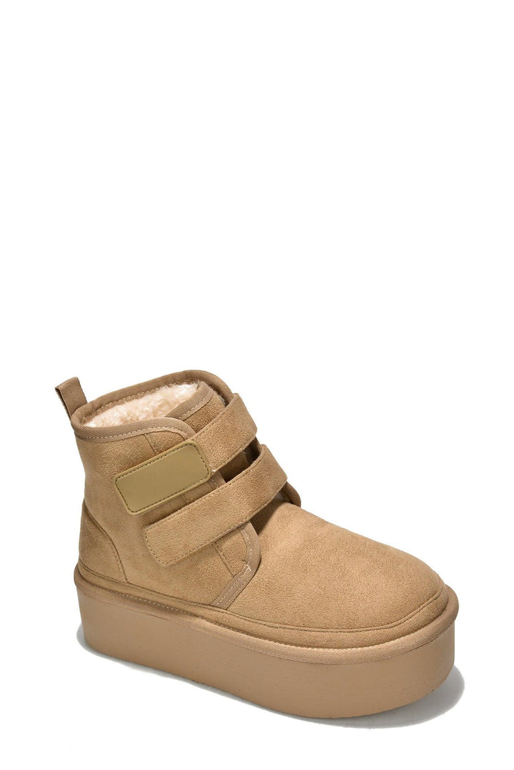 FELIA - KHAKI - BOOTIES by CAPE ROBBIN round toe fur-lined double velcro straps lug sole platform suede finish ankle booties Slide into these ultra-comfy Felia ankle booties and start walking on Cloud 9. The double velcro straps are the icing on the cake. Enjoy them in black,camel,gray,khaki,and olive.