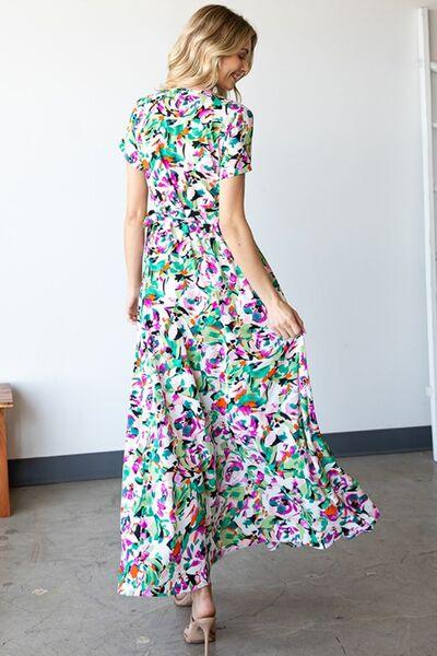 First Love Slit Printed Surplice Tie Waist Short Sleeve Dress