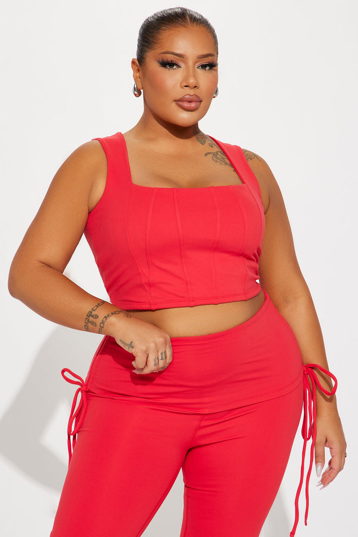 Available In Red. | Active Top | Super Soft | Sleeveless | Square Neck | Corset Detail | Padded | Medium Impact | Pair with "First Position Super Soft Active Pant" | Body: 77% Polyester 23% Spandex | Inner Mesh: 82% Nylon 18% Spandex | Imported