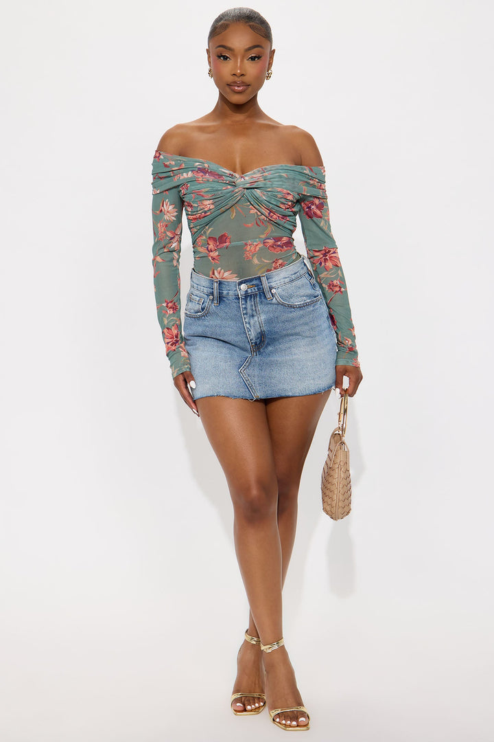 Floral Embrace Ruched Off Shoulder Bodysuit - Sage/combo