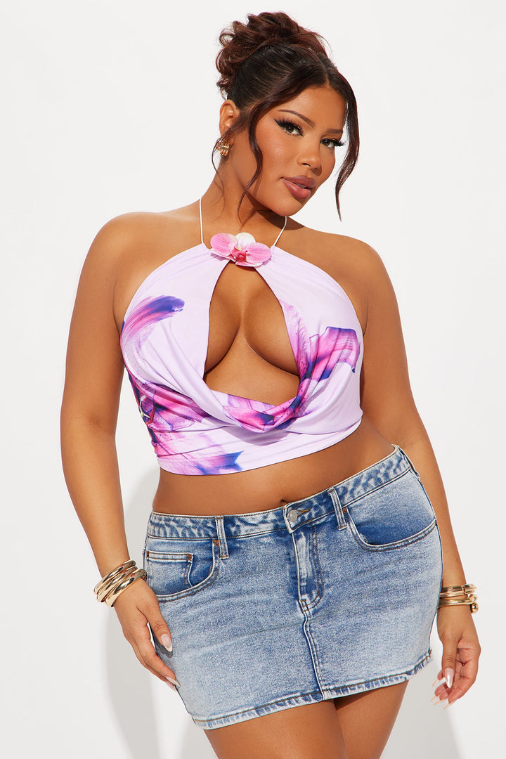 Available In Purple/combo. | Halter Top | Stretch | Tie Neck | 3D Flower | Ruched | Cowl Neck | Backless | Tie Back | Disclaimer: Print Placement May Vary | 93% Polyester 7% Spandex | Imported