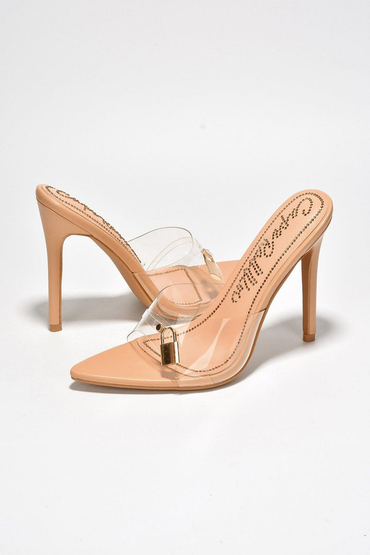 FLOSSI - BEIGE - HEELS by CAPE ROBBIN open pointy toe lightly cushioned footbed padlock detailing PU hologram TPU rhinestone press on footbed rubber outsole Elevate your wardrobe with these sleek and timeless Flossi heels. Features a dainty stiletto heel for a powerful look,a clear upper with shiny lock decor,and a pointy toe for that always stylish vibe.