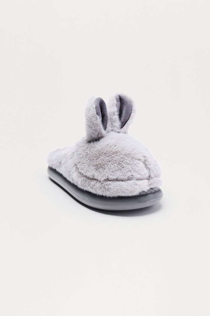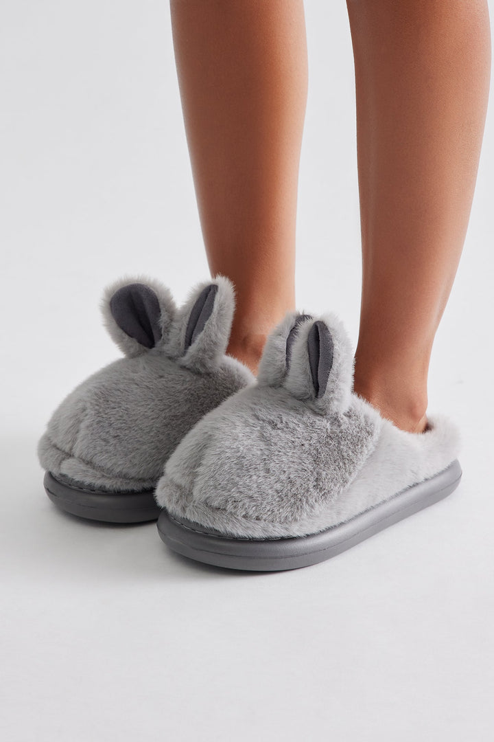 Available In Grey. | Closed Toe Slippers | Faux Fur | Bunny Ears Detail | Round Toe | Flat Heel | Imported