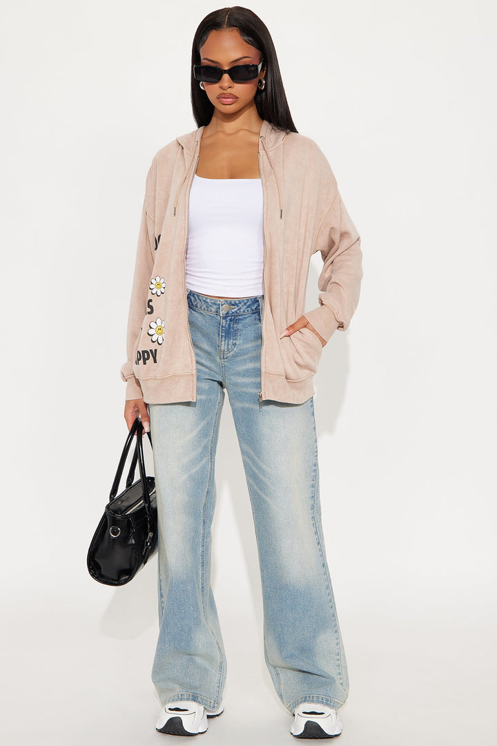 Available In Taupe. | Sweatshirt Zip-Up | Long Sleeve | Hoodie | Front Screen | 65% Cotton 35% Polyester | Imported