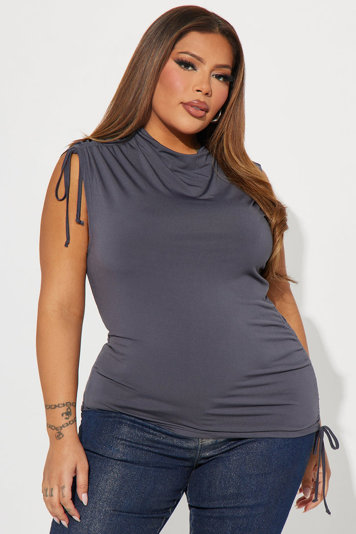 Available In Black And Grey. | Blouse | Cowl Neck | Sleeveless | Drawstring Detail | Ruched Detail | Stretch | 95% Polyester 5% Spandex | Imported