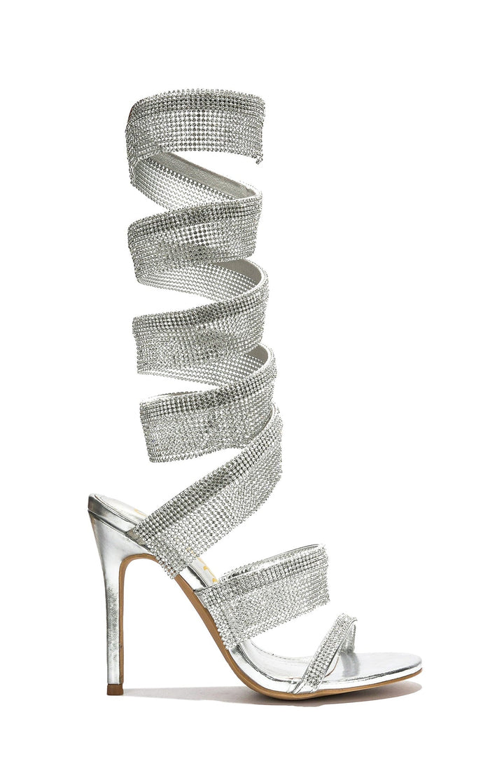 FRED - SILVER - HEELS by CAPE ROBBIN Heel: 4 inch. Strappy wrap around PU leather insole with memory foam cushioning for added comfort Rhinestone thick strap Round toe Unleash your inner diva with these dazzling Fred heels,designed to make you the center of attention. The intricate wrap-around straps are encrusted with sparkling rhinestones,creating a stunning shimmer effect that catches the light with every step.\