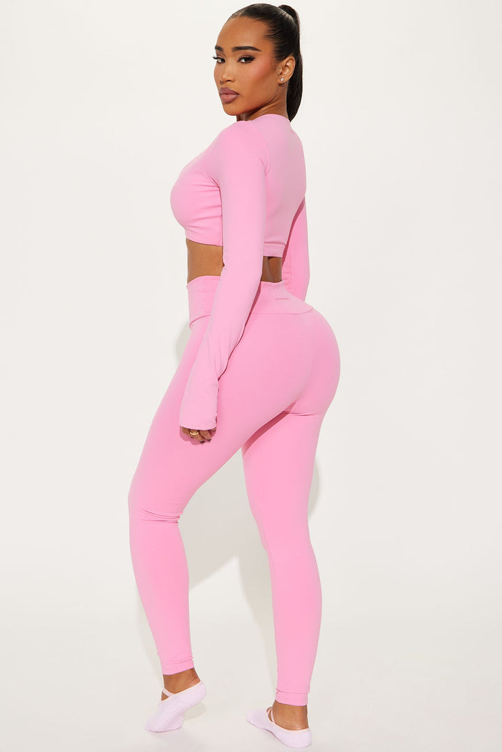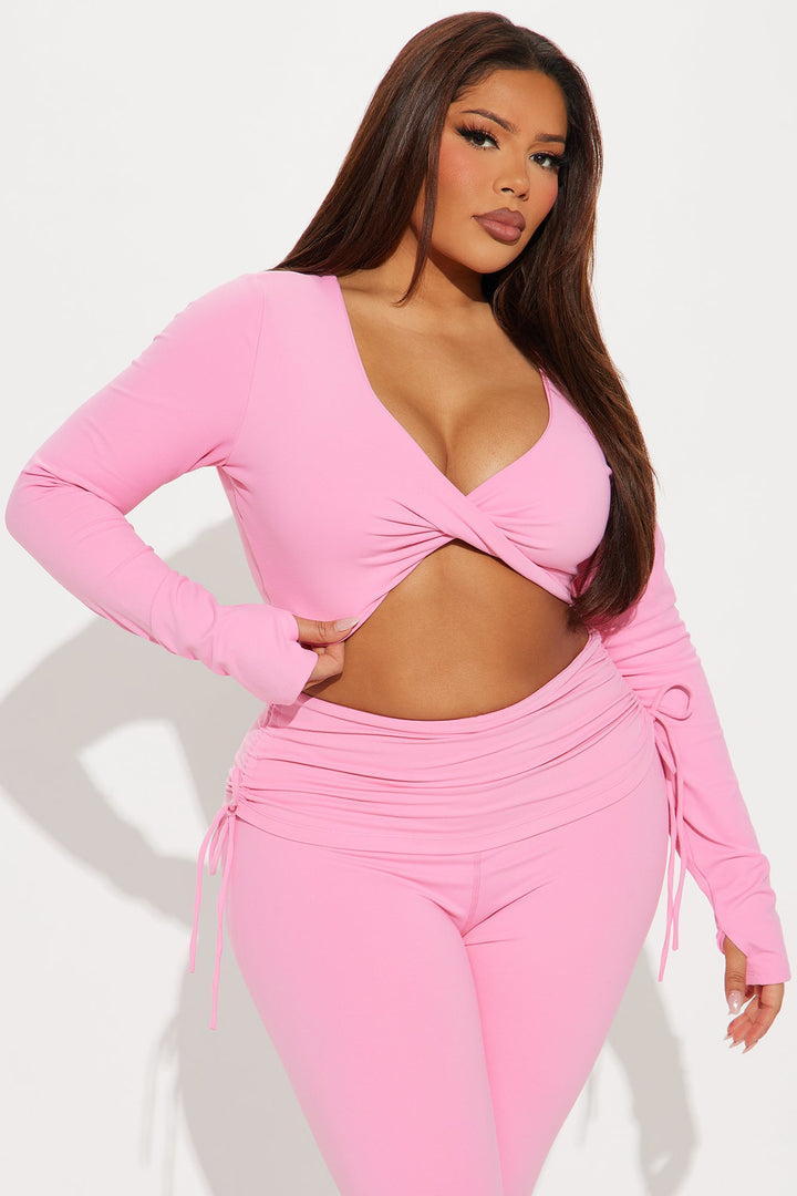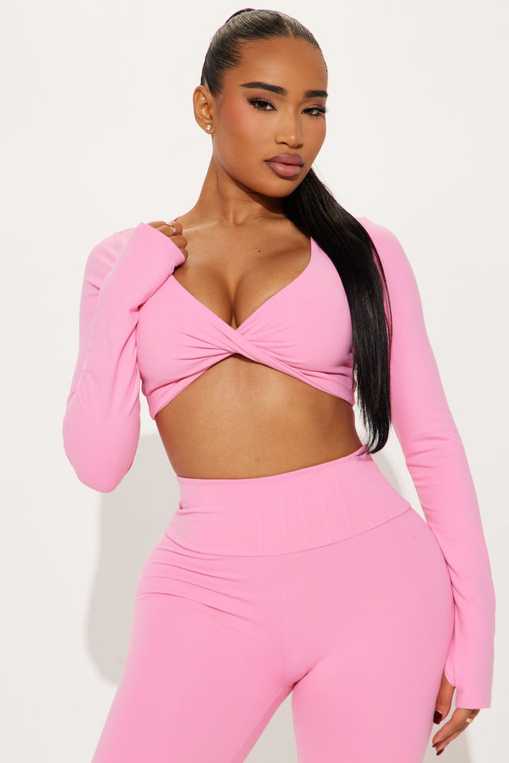 Available In Bubblegum Pink And Sage. | Active Top | V Neck | Long Sleeve | Super Soft | Twist/ Knot Detail | Cropped | Medium Impact | Stretch | Pair With "Glow Super Soft Active Short" | Main Fabric: 77% Polyester 23% Spandex | Inner Mesh: 94% Nylon 6% Spandex | Imported