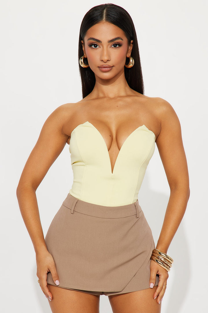 Available In Black, Butter Yellow And White. | Corset Bodysuit | Sleeveless | Deep V-Neck | V-Wire | Cheeky Bottom | Snap Button Closure | Stretch | Final Sale | Self:97%Polyester 3%Spandex | Lining:100%Polyester | Imported