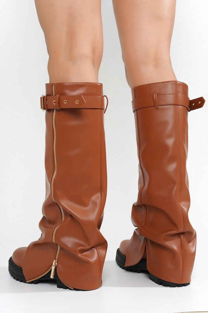 FUNAFUTI - TAN - BOOTS by CAPE ROBBIN closed round toe knee high platform boots zipper closure lug sole metallic PU rubber outsole lightly cushioned footbed Cape Robbin's Funafuti boots serve a unique style,instantly elevating your wardrobe. Plus,the fold-over and belt buckle design is a showstopper.