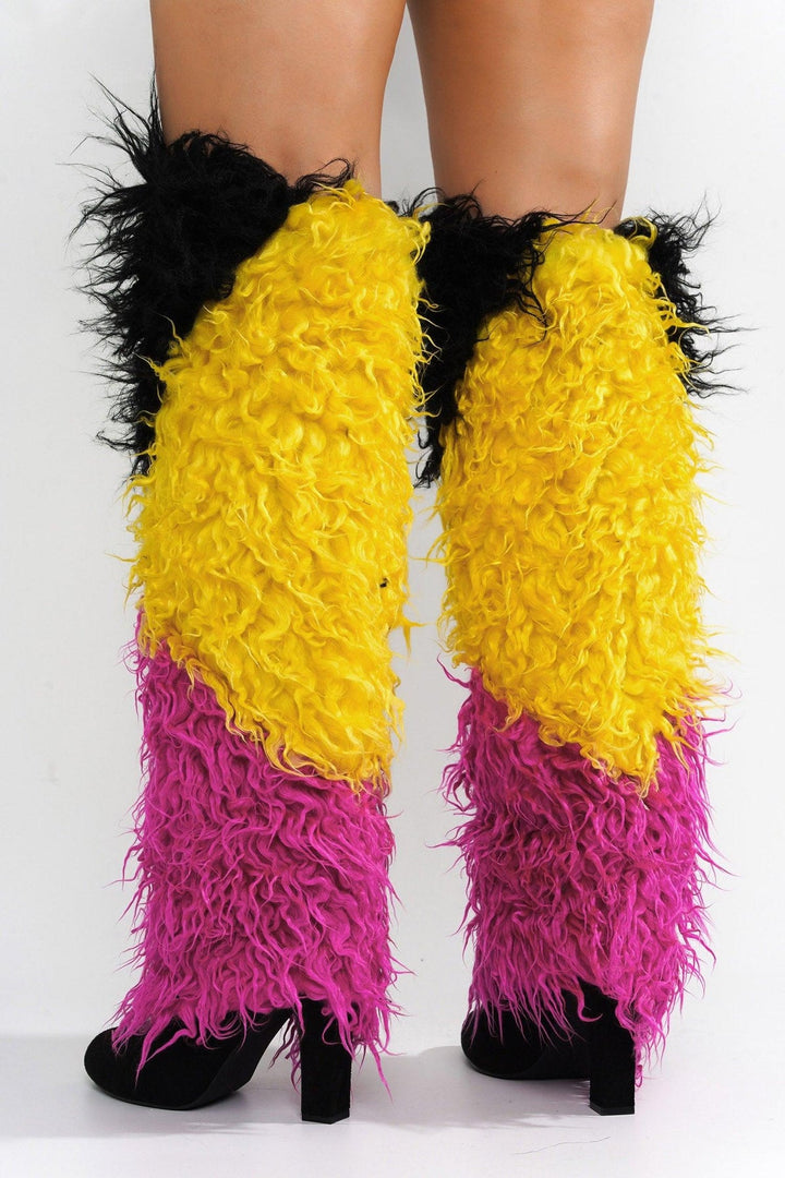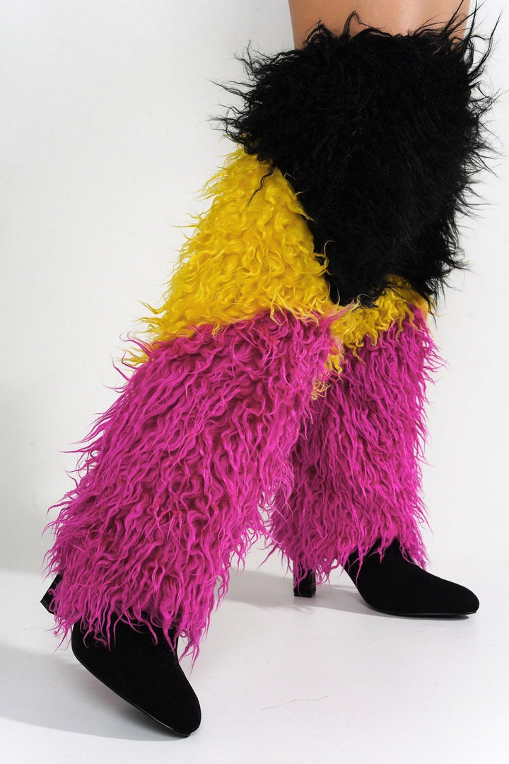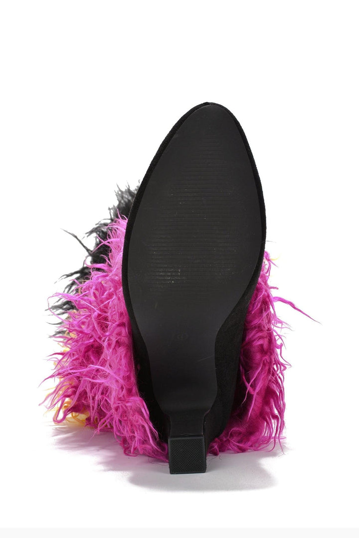 FURIFURI - MULTI - BOOTS by CAPE ROBBIN pointy toe ~4 inch heel suede upper fur trim knee-high boots multicolor lightly cushioned footbed rubber outsole Be the envy of the evening! Cape Robbin's Furifuri serves style and attitude all day. The lush design is foxy and sure to get you noticed instantly.