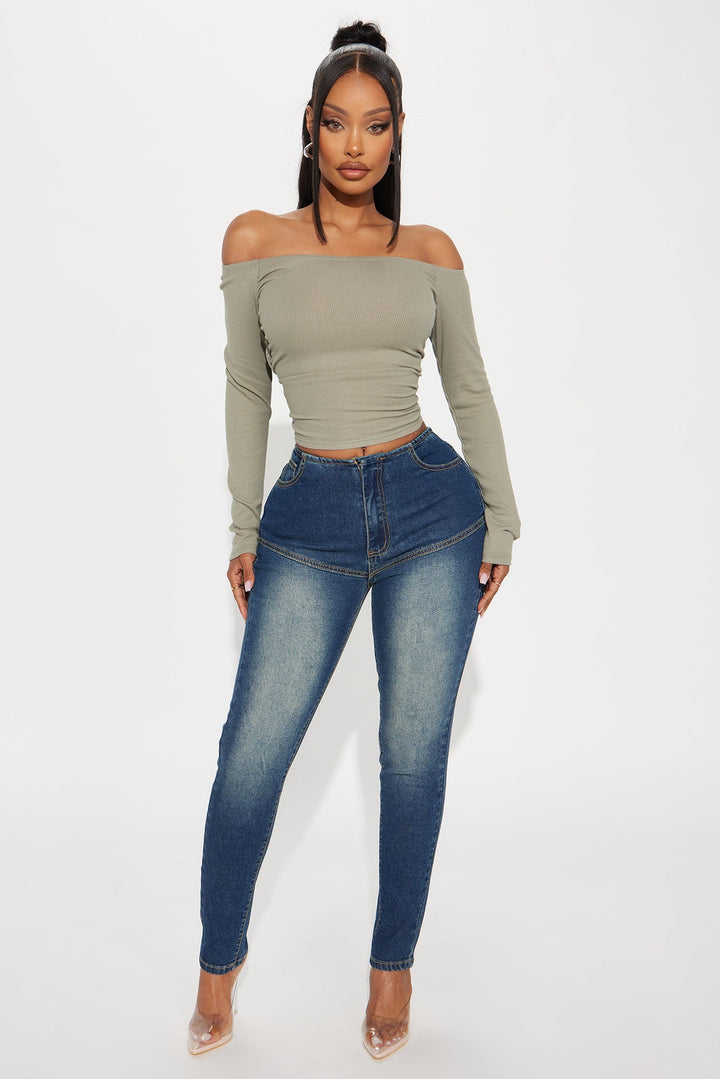 Available In Black And Olive. | Off Shoulder Top | Long Sleeve | Ruched Detail | Ribbed | Stretch | 60% Cotton 35% Rayon 5% Spandex | Imported