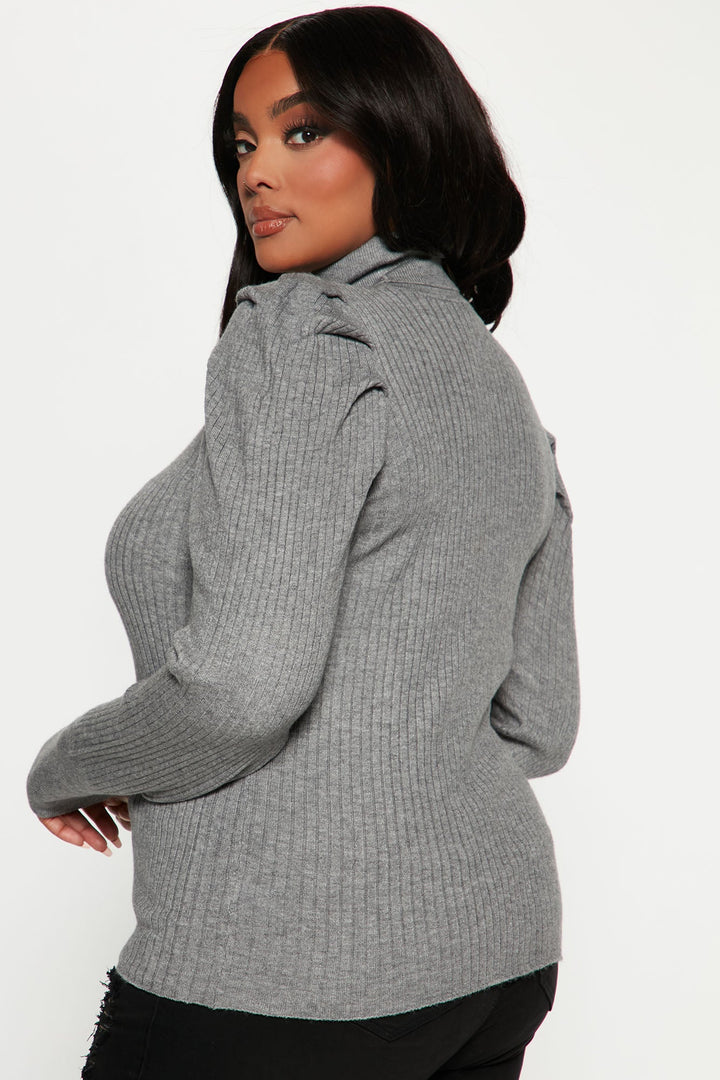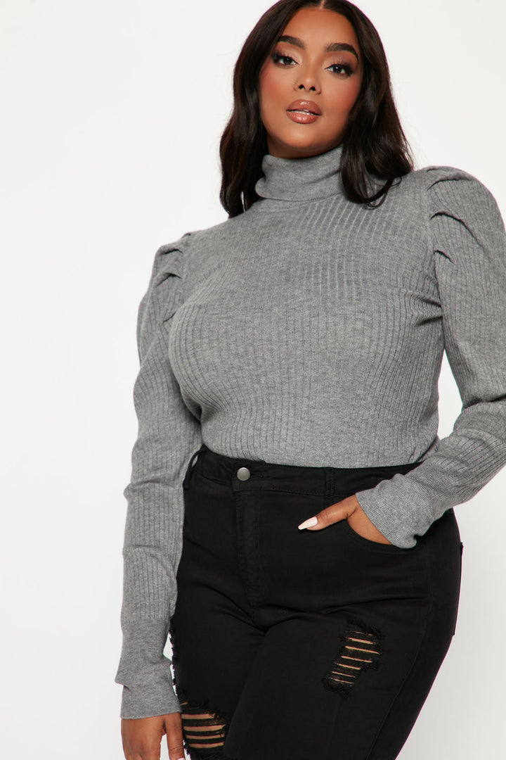 Available In Black, Chocolate, Heather Grey And Hunter. | Pullover Sweater | Rib Knit | Turtleneck | Long Sleeve | Puff Sleeve | 51% Rayon 28% Polyester 21% Nylon | Imported