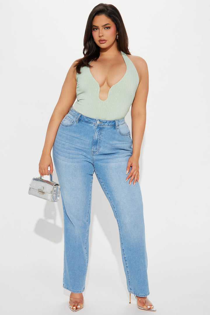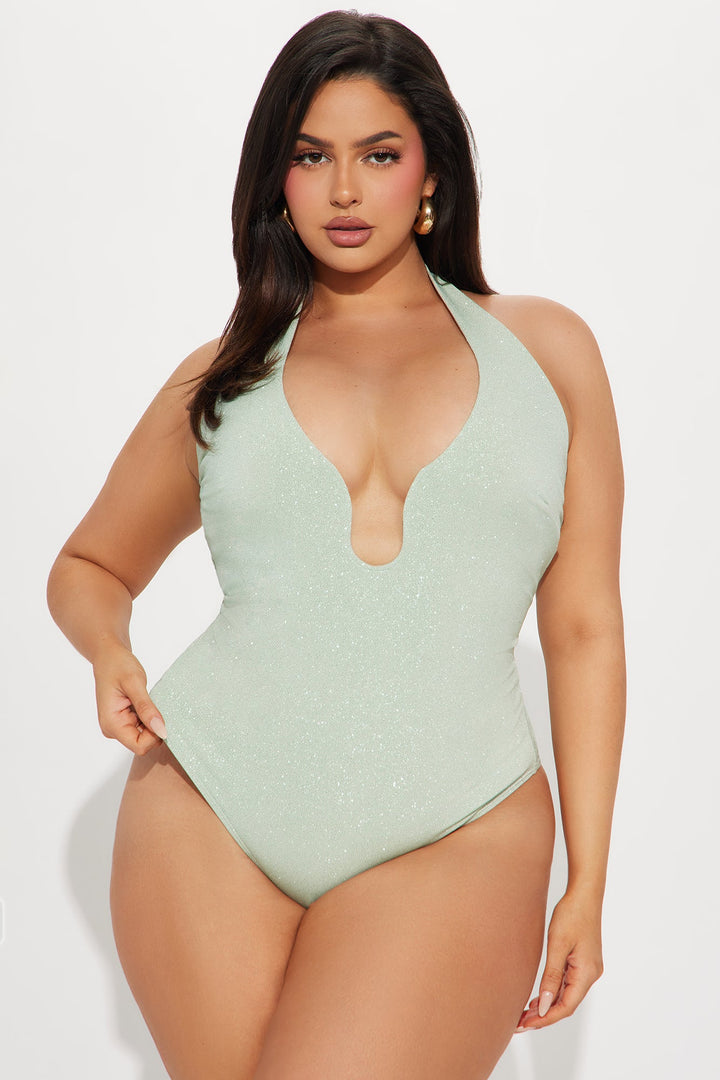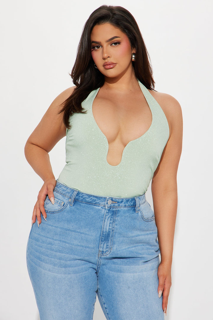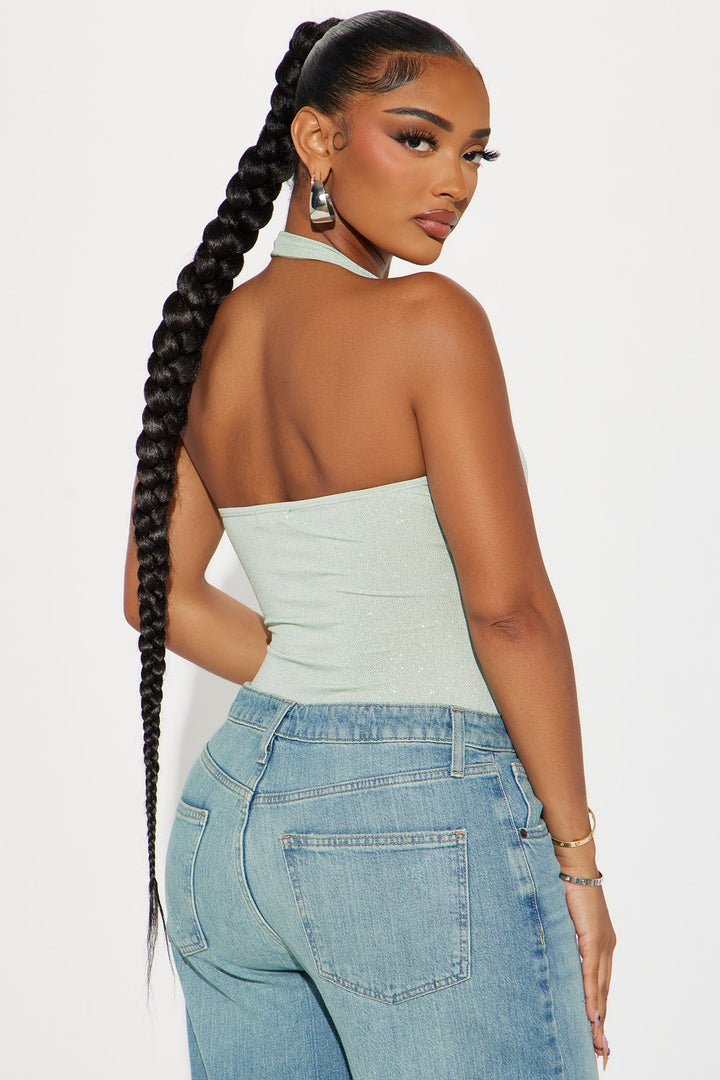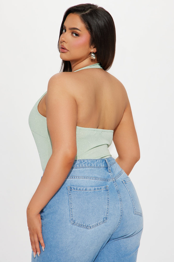 Available In Sage. | Halter Bodysuit | Sleeveless | V-Wire | Cheeky Bottom | Snap Button Closure | Glitter | Stretch | Final Sale | Self: 95% Polyester 5% Spandex | Lining: 100% Polyester | Imported