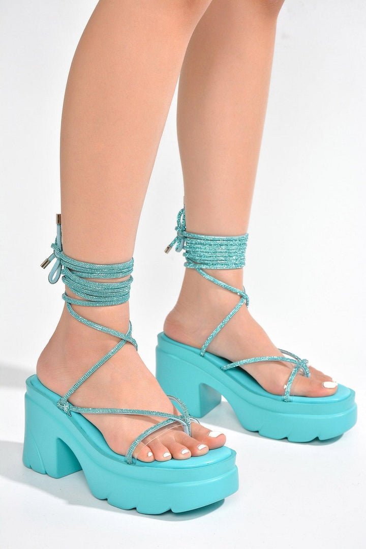 GILIAN - BLUE - HEELS by CAPE ROBBIN round toe mid block heels lug platform strappy lace up rhinestone rope EVA Add a touch of glitz and glamour to your look with these beautiful Gilian mid block heels. Featuring a stylishly strappy design,these lace up heels have a rhinestone rope and glimmering accents that will make any outfit sparkle. Available in black,orange,nude,and blue.