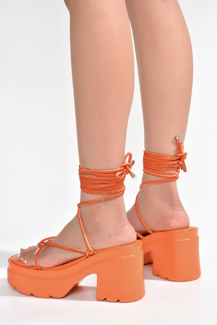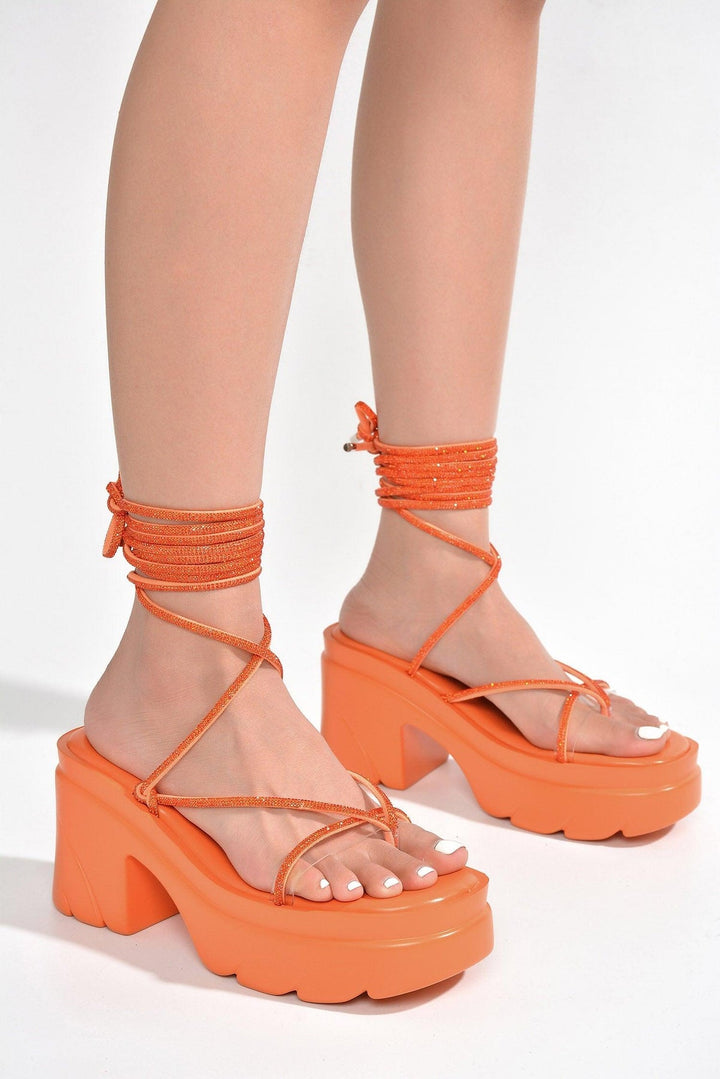 GILIAN - ORANGE - HEELS by CAPE ROBBIN round toe mid block heels lug platform strappy lace up rhinestone rope EVA Add a touch of glitz and glamour to your look with these beautiful Gilian mid block heels. Featuring a stylishly strappy design,these lace up heels have a rhinestone rope and glimmering accents that will make any outfit sparkle. Available in black,orange,nude,and blue.