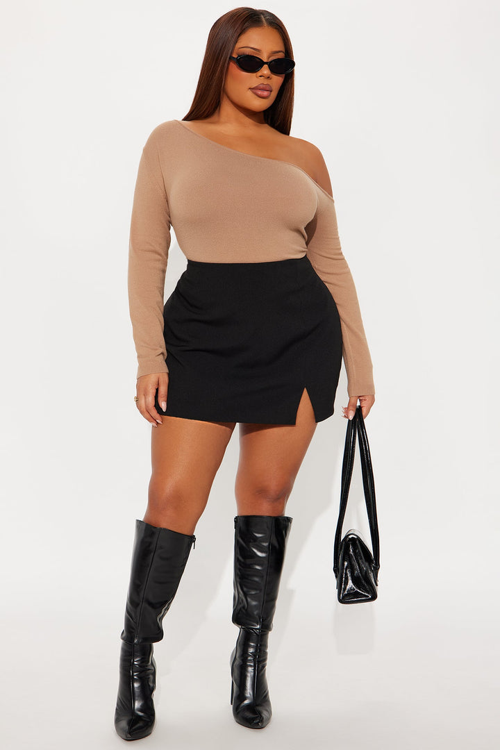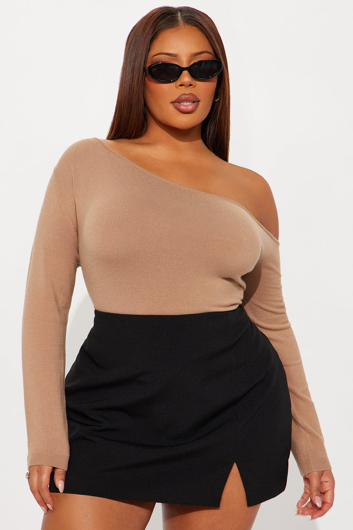 Available In Black, Ivory And Mocha. | Pullover Sweater | Long Sleeve | One Shoulder | Ribbed Hem | Self: 83%Acrylic 17%Spandex | Imported
